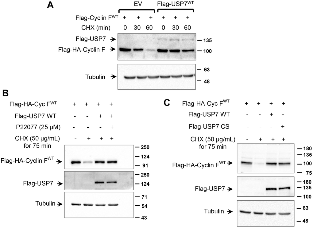 We next investigated whether USP7 regulates cyclin F protein stability. HCT116 cells were transfected with Flag-HA-cyclin F in the presence or absence of Flag-USP7-WT. As shown in Figure 5A, half-life of cyclin F was increased by USP7 overexpression (~ 60 min), whereas half-life of cyclin F in mock-transfected cells was about 30 min. We next evaluated whether this stabilization was dependent on the deubiquitylase activity of USP7. We employed two approaches: the first involved pharmacological inhibition of USP7 activity by P22077, and the second involved the expression of a catalytically-deficient mutant of USP7. Ectopic cyclin F levels robustly reduced to less than 50% of control levels, when de novo protein synthesis was inhibited by cycloheximide. This reduction was rescued in cells overexpressing wild-type Flag-USP7 (Figure 5B, 5C), and regardless of USP7 inhibition by P22077 (Figure 5B; last lane). These data suggest that the USP7-induced stability of cyclin F was independent of the deubiquitylase activity of USP7. This finding was further corroborated in experiments with the catalytic mutant of USP7, Flag-USP7-CS, that harbors a mutation of the critical Cys223 to Ser within the catalytic domain. As shown in Figure 5C, the cycloheximide-induced reduction in cyclin F levels was efficiently rescued in cells overexpressing Flag-USP7-CS, similar to that in cells overexpressing Flag-USP7-WT.