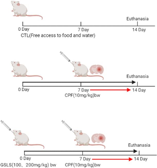 This work acquired SPF male Kunming mice weighing 18-22 g from YISI Experimental Animals Co., Ltd. (license No. SCXK (Ji) – 2020 - 0001, Jilin, China). Each experiment was carried out following animal experimental guidelines released by Jilin Agricultural University. Our protocols gained approval from Institutional Animal Care and Use Committee of Jilin Agricultural University with reference to the AVMA Guidelines for Euthanasia of Animals: 2013 Edition (American Veterinary Medical Association) and the 8th edition of Guide for the Care and Use of Laboratory Animals released by the National Academies Press (Washington, D.C.). This study used male rats because chronic research finds that males show high sensitivity and susceptibility to chemical-triggered toxicity effect compared with females [30]. Mice were divided as 4 groups, respectively, control, CPF, CPF (10mg/kg) + GSLS (100mg/kg) and CPF (10mg/kg) + GSLS (200mg/kg). There are 10 mice in each group. The control mice were administered with saline at an equivalent amount for two weeks. Mice in model group were administered with saline at an equivalent amount for the first week and CPF (10mg/kg/d) in the second week. The low- and high-dose GSLS groups were pre-protected at 100 and 200 mg/kg/d for one week, in combination with CPF (10mg/kg/d) + GSLS (100mg/kg/d) and CPF (10mg/kg/d) + GSLS (200mg/kg/d) for the second week respectively. All modes of administration were intragastric. The dosage regimen is presented in Figure 1.