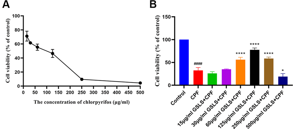 HT22 cells displaying favorable morphological and growth conditions were added into the 96-well plates. When achieving adhesion, non-cytotoxic cells with good cell viability were pre-protected with GSLS (15, 30, 60, 125, 250, 500 μg/ml) for 12 hours. Next, 15 μg/ml CPF was added to treat cells for a 3-h period within the 96-well plates. After that, CCK-8 solution (10 μL) was poured into diverse wells, while OD values were determined with the microplate reader under 37° C after 2 hours at 450 nm.
