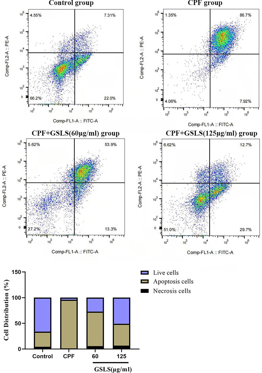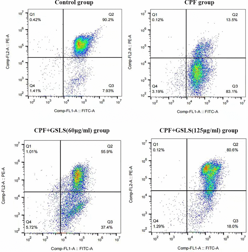 For illustrating how CPF induced apoptosis, MMP was analyzed. JC-1 is the indicator for ΔΨm, which was adopted in the present work for analyzing mitochondrial depolarization. According to Figure 5, FCM demonstrated the role of CPF treatment in markedly reducing red/green fluorescence ratio, demonstrating the decreased ΔΨm as well as mitochondrial depolarization, finally promoting apoptosis. Nevertheless, compared with GSLS treatment group, red/green fluorescence ratio markedly returned to normal level after GSLS treatment. GSLS saved the transformation of ΔΨm, which indicated that GSLS reduced mitochondrial dysfunction, thus inhibiting CPF-induced apoptosis.