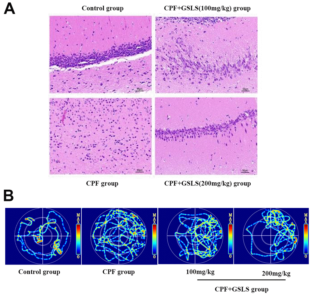 Control mice had larger conical hippocampal neurons, neatly arranged, with well-defined cytoplasm and nuclei, whereas those in the CPF group were significantly reduced, with loosely arranged disorganized cells and markedly atrophied cytoplasmic lysates. The histopathological results showed that CPF injured hippocampal neurons. GSLS exposure improved pathological injury, with better improvement in high-dose group (Figure 7A).
