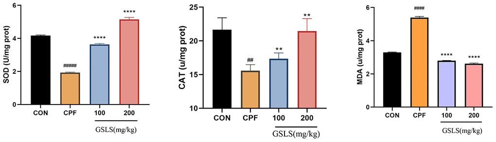 In Figure 8, relative to control mice, control group showed markedly lower CAT, SOD activities (P<0.05). By contrast, compared with control group, MDA content of model group increased significantly. Relative to model group, GSLS group had markedly increased CAT, SOD activities of GSLS group, while MDA content was significantly decreased. It is suggested that GSLS can promoted CAT and SOD activities while reducing MDA content of mice induced by CPF.
