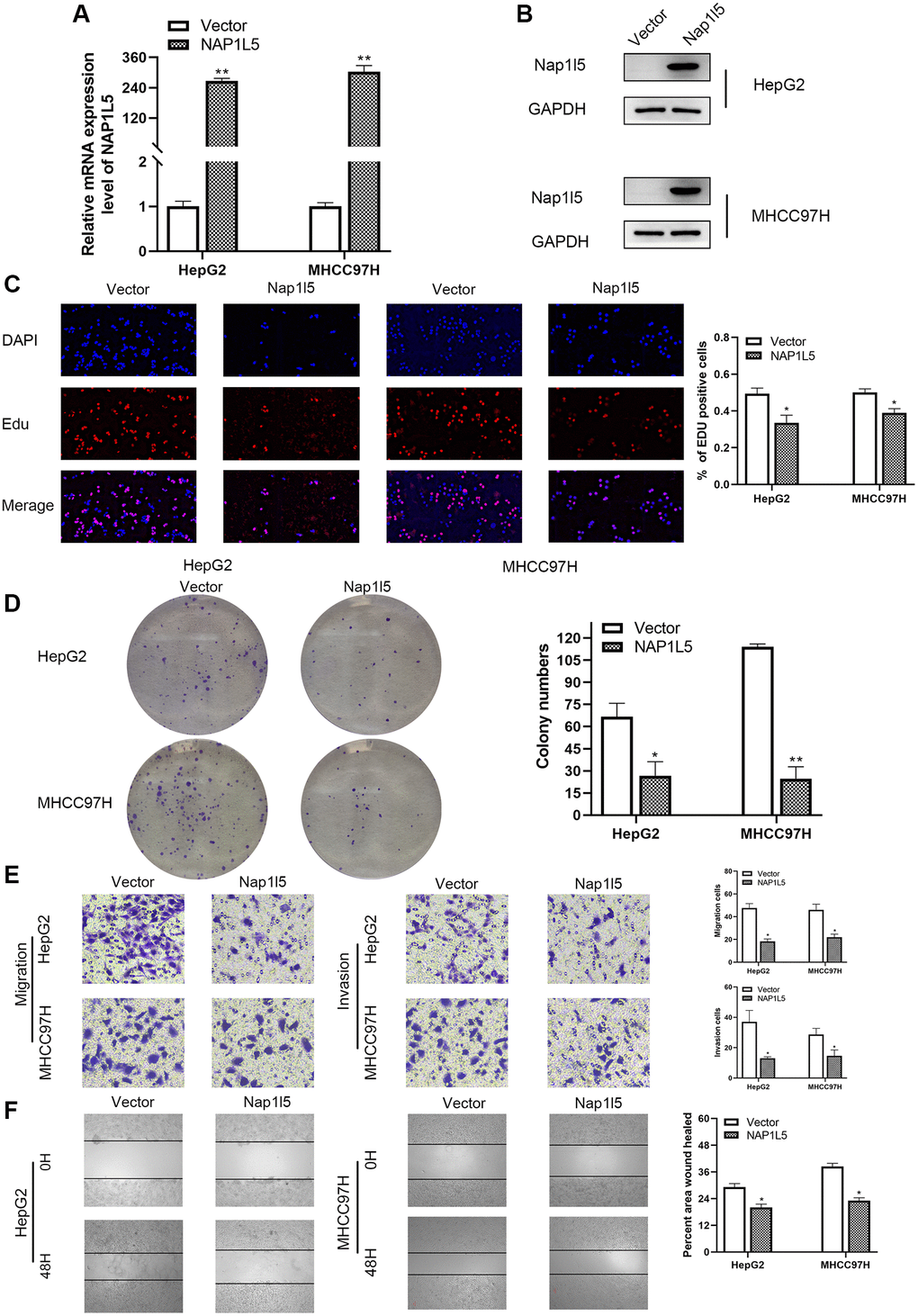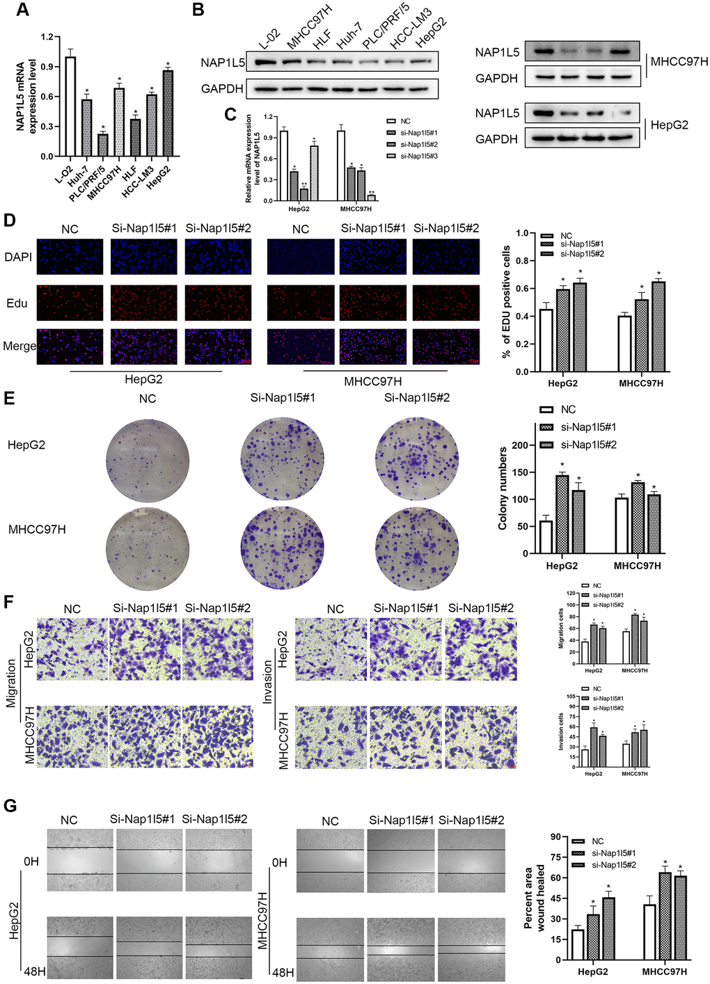 We used RT–qPCR and Western blotting to study the expression of NAP1L5 in hepatocellular carcinoma cell lines and noncancerous liver cell lines. We found that the mRNA and protein expression levels of NAP1L5 in hepatocellular carcinoma cell lines were lower than those in noncancer cell lines (Figure 2A, 2B). MHCC97H and HepG2 cells were selected, and lentivirus carrying small interfering RNA (siRNA) was used to knock down the expression level of NAP1L5. Compared with the negative control at the mRNA and protein levels, the knockdown efficiency of three NAP1L5 siRNAs was confirmed (Figure 2C). Among the three siRNAs tested, siRNA#1 and siRNA#2 produced consistent knockdown results in MHCC97H and HepG2 cell lines, so they were selected for follow-up studies. To determine the effect of NAP1L5 on the function of HCC cells, we performed a variety of in vitro experiments. EDU staining, colony formation assays, Transwell assays and wound healing migration assays all showed consistent results: the downregulation of NAP1L5 significantly promoted the proliferation, invasion and migration of MHCC97H and HepG2 cells (Figure 2D–2G). We used plasmids to overexpress NAP1L5 in MHCC97H and HepG2 cells. The efficiency of NAP1L5 overexpression was confirmed by comparison with the vector at the mRNA and protein levels (Figure 3A, 3B). Repeating the above experiments, it was found that overexpression of NAP1L5 significantly inhibited the proliferation, invasion and migration of MHCC97H and HepG2 cells (Figure 3C–3F). These results are consistent with the downregulated data of NAP1L5, suggesting that NAP1L5 may be a key factor in the regulation of hepatoma cell function.