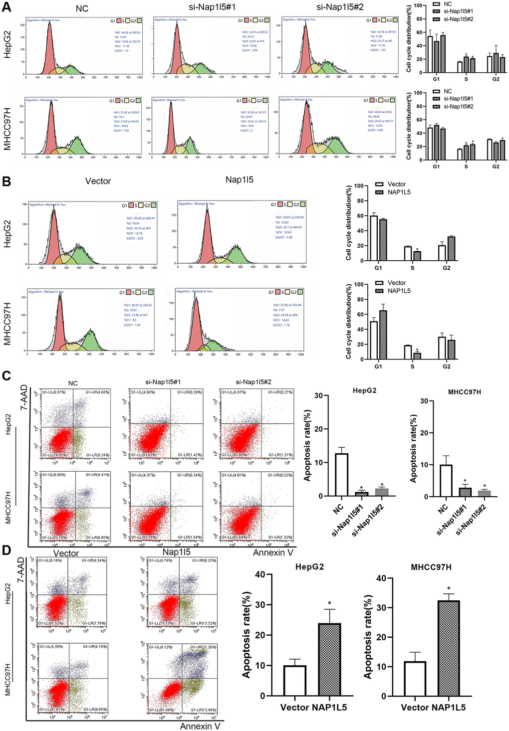 We measured the cell cycle distribution by flow cytometry and found that the percentage of S phase cells downregulated by NAP1L5 among HepG2 and MHCC97H cells was significantly higher than that in the control group (Figure 4A). In contrast, in HepG2 and SMMC7721 cells overexpressing NAP1L5, the number of cells decreased in S phase (Figure 4B). Flow cytometry analysis using Annexin V-APC/7-AAD staining showed that the downregulation of NAP1L5 inhibited apoptosis in the two cell lines (Figure 4C), while the upregulation of NAP15 promoted apoptosis (Figure 4D). The above data suggest that NAP1L5 can induce a decrease in S phase cells and promote the apoptosis of HCC cells.