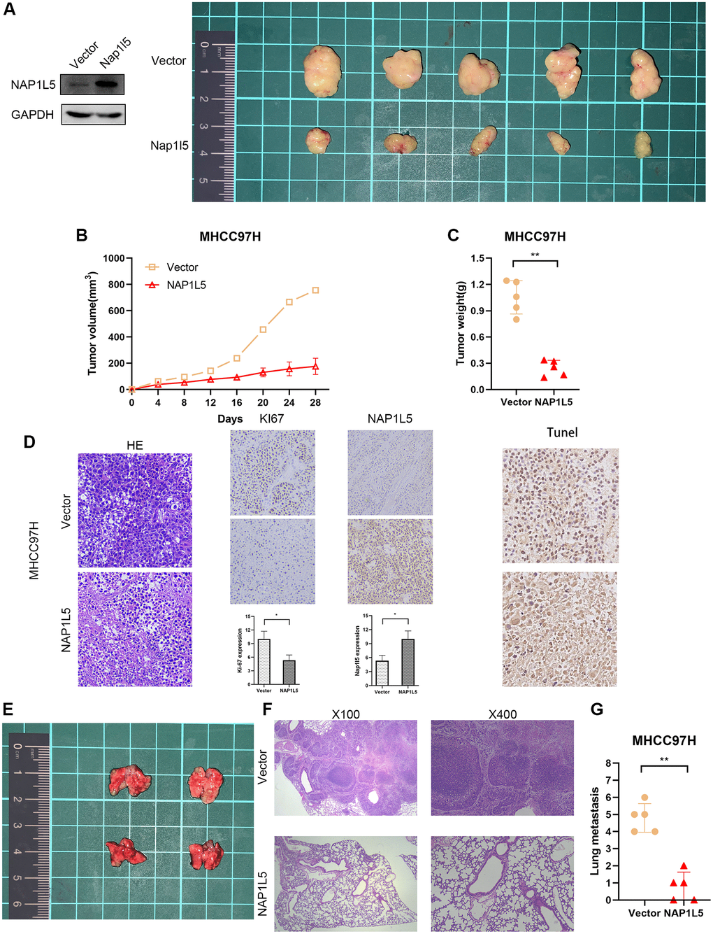 MHCC97H cells stably overexpressing NAP1L5 were implanted into nude mice in the experimental group, and MHCC97H cells transferred into the control vector were implanted into nude mice in the control group (MHCC97H cells transfected with lentivirus vector were verified by Western blotting), and the proliferation of tumor cells in vivo was observed. All mice were monitored every 4 days, and the mice were killed four weeks later. The average tumor weight and volume of mice in the experimental group decreased significantly in the fourth week (Figure 5A–5C). The transplanted tumors of the two groups underwent HE and immunohistochemical staining of Ki-67, NAP1L5 and TUNEL. We found that the Ki67 score was lower in the experimental group, while the NAP1L5 and TUNEL scores were higher (Figure 5D). To explore the effect of NAP1L5 on tumor metastasis, MHCC97H cells carrying the NAP1L5 lentivirus vector or control vector were injected into the experimental and control groups through the tail vein. The mice were killed 4 weeks later, and the lung tissue was taken to observe the number of metastatic foci and stained by HE. We found that the overexpression of NAP1L5 was significantly associated with reduced lung metastasis in mice (Figure 5E). In addition, we performed a pathological analysis of the lung tissue of nude mice, and the results showed that the incidence of lung metastasis in the experimental group was lower than that in the control group (Figure 5F, 5G). The above data further confirmed the antitumor activity of NAP1L5 against hepatocellular carcinoma.