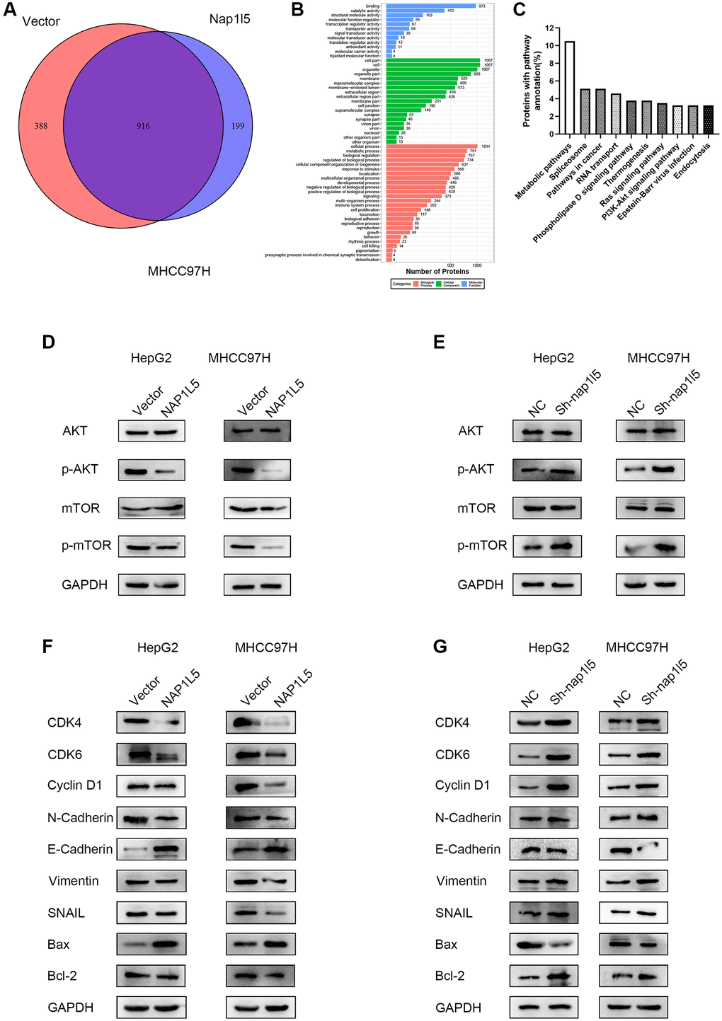 The MHCC97H cells carrying the control and lentivirus vectors with high expression of NAP1L5 were enriched with 916 genes by mass spectrometry, while GO enrichment analysis showed that there were 199 independent differentially expressed genes after NAP1L5 overexpression compared with the control vector group (Figure 6A). The GO function analysis of the two groups of cells is shown in Figure 6B. The independent difference in 199 genes was highly correlated with the PI3K/AKT/MTOR signaling pathway (Figure 6C). We determined the key proteins in the PI3K/AKT/MTOR signaling pathway and found that overexpression of NAP1L5 decreased the phosphorylation of AKT and mTOR in HepG2 and MHCC97H cells (Figure 6D), indicating that PI3K/AKT/mTOR signaling was inhibited. In contrast, NAP1L5 knockdown enhanced the PI3K/AKT/mTOR signaling activity (Figure 6E). In addition, the overexpression of NAP1L5 changes the expression of indispensable key regulators in cell cycle regulation, epithelial-mesenchymal transition (EMT) and apoptosis. Western blotting showed that the expression of cyclin D1; CDK4; CDK6; EMT-related proteins N-cadherin, vimentin, and SNAIL; and apoptosis-related protein Bcl-2 decreased in HepG2 and MHCC97H cells overexpressing NAP1L5, while the levels of E-cadherin and Bax were upregulated (Figure 6F). The Western blotting results in the cells downregulated by NAP1L5 were the opposite (Figure 6G).