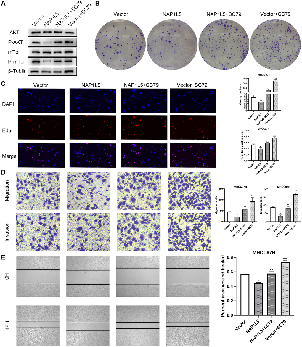 We promoted the activity of the PI3K/AKT/mTOR signaling pathway by SC79 treatment, and the reduction in p-AKT and p-mTOR was restored after adding SC79 to NAP1L5-overexpressing MHCC97H cells (Figure 7A). It was also found that SC79 induced and restored the inhibitory effect of NAP1L5 overexpression on the proliferation, migration and invasion of MHCC97H cells (Figure 7B–7E). In summary, these data suggest that NAP1L5 inhibits HCC progression by inhibiting the PI3K/AKT/mTOR signaling pathway.