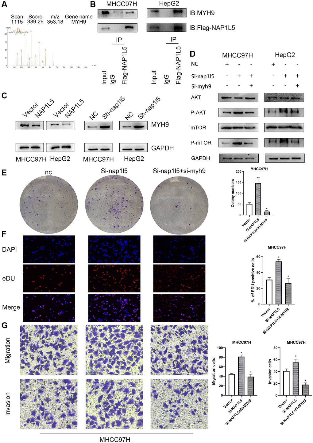 Further mass spectrometry analysis revealed that MYH9 was a protein captured by NAP1L5 (Figure 8A). Co-IP verified the specificity of this interaction, indicating that NAP1L5 could bind to MYH9 (Figure 8B). Overexpression of NAP1L5 resulted in a decrease in MYH9 protein levels in MHCC97H and HepG2 cells (Figure 8C). In contrast, NAP1L5 knockdown led to an increase in MYH9 protein (Figure 8C). Many previous studies have confirmed that MYH9 promotes the occurrence and development of hepatocellular carcinoma, such as the research of Professor Fang Weiyi of Southern Medical University on the role of MYH9 in HCC [12, 13]. The promotive role of MYH9 in hepatocellular carcinoma was confirmed, in accordance with previous studies. Knockdown of both NAP1L5 and MYH9 and downregulation of MYH9 genes in MHCC97H cells weakened the ability to promote phosphorylation of AKT and mTOR formed by low expression of NAP1L5 (Figure 8D) and restored the enhanced proliferation, migration and invasion of HCC cells (Figure 8E–8G). These data demonstrate that NAP1L5 inhibits the progression of hepatocellular carcinoma and PI3K/AKT/MTOR signaling via MYH9.