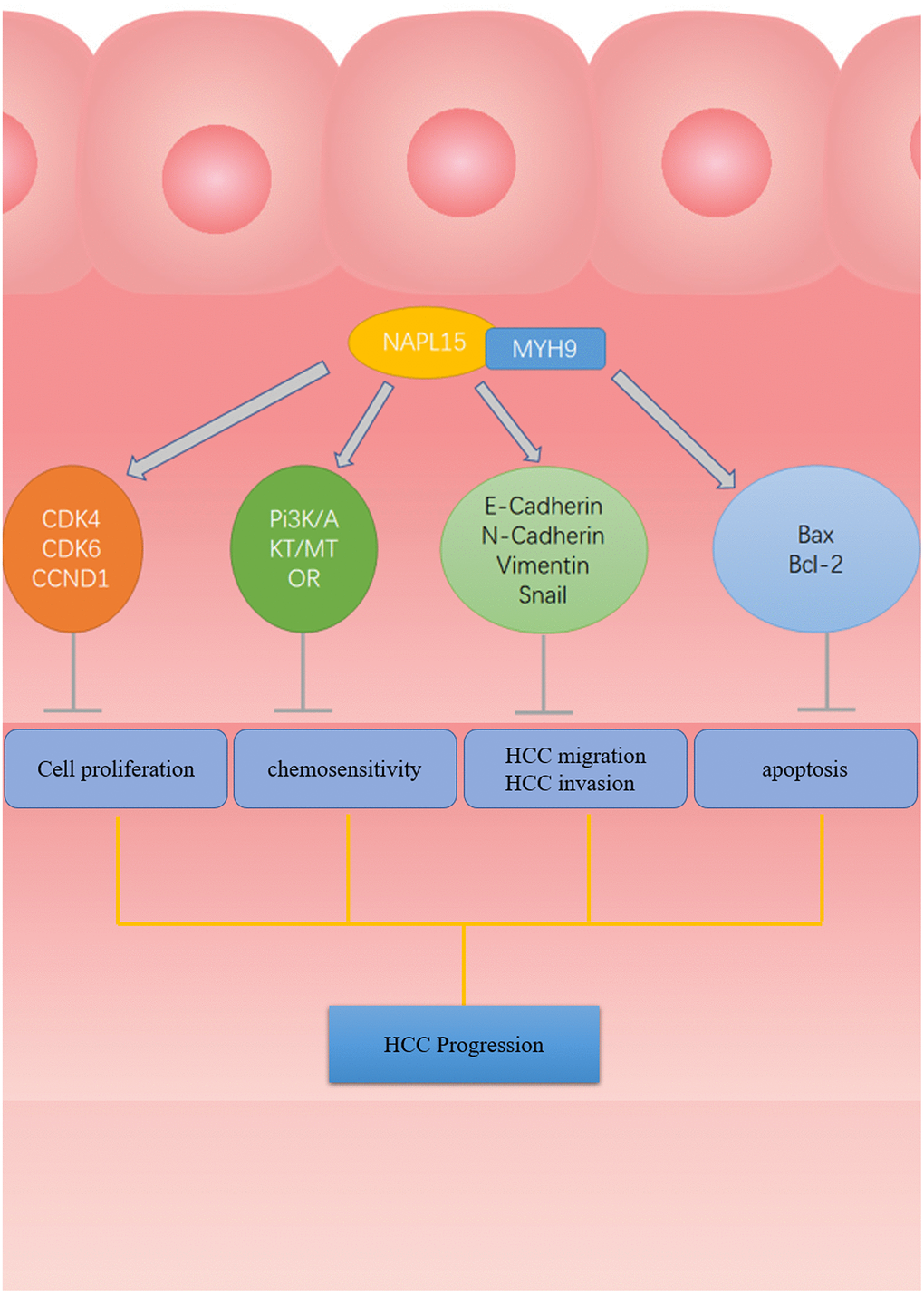 Figure 9 is a schematic diagram that reveals the process by which NAP1L5 binds MYH9 to regulate cycle, apoptosis, EMT-related proteins and downstream PI3K/AKT/mTOR signaling pathways that affect the progression of HCC (Figure 9).