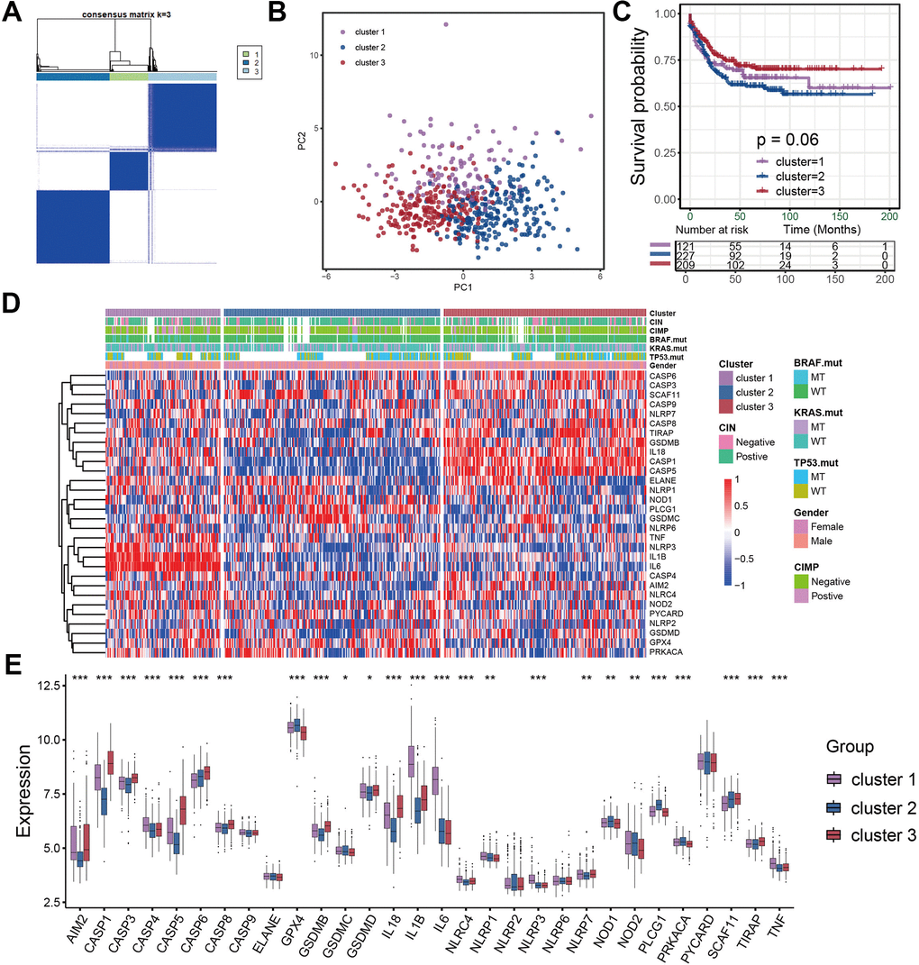 The pyroptosis-related genes were derived from published studies. In order to identify distinct pyroptosis characterization clusters in colon cancer, we used ConsensuClusterPlus R package to execute consensus clustering based on the mRNA expression of these pyroptosis-related genes. Consensus clustering is repeated 1000 times to ensure the stability of molecular classification [39].