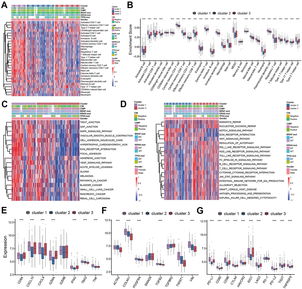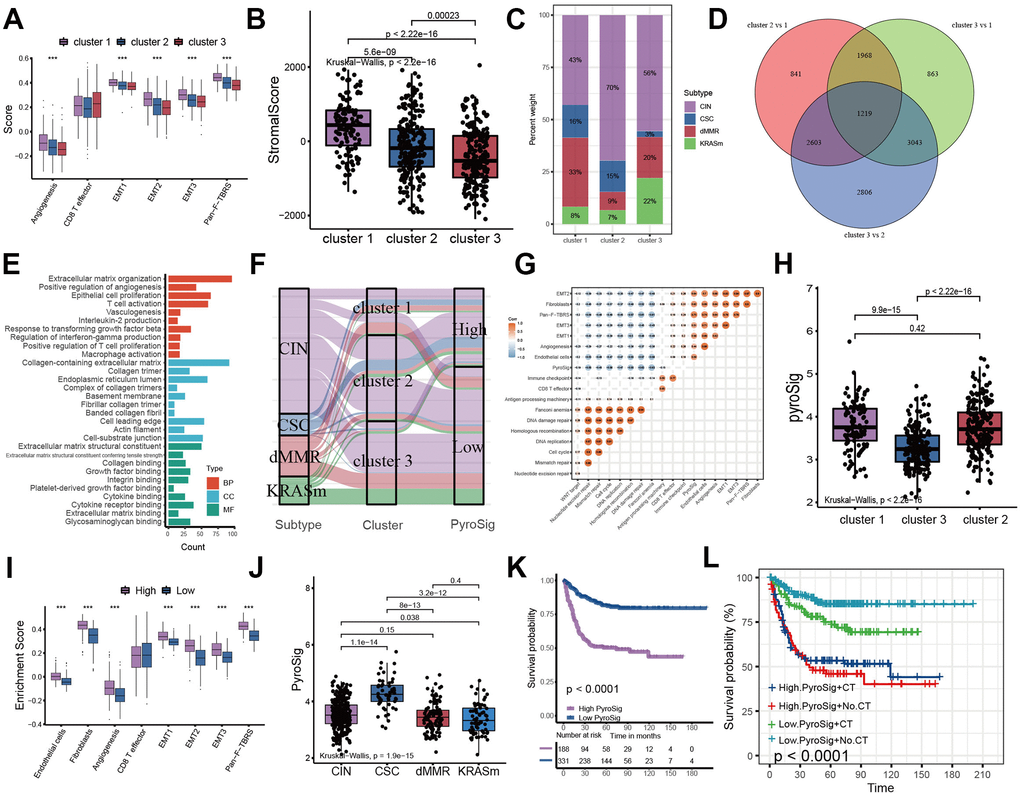 We analyzed the expression of chemokines and cytokines that characterize these three pyroptosis characterization clusters to further explore their characteristics of TME immunoregulation (Figure 3E–3G) [16]. The results indicated that the mRNA expression of TGFb/EMT pathway was significantly upregulated in cluster 1 subtypes (Figure 3F), and the cluster 1 and cluster 3 subtypes demonstrated increased expression of mRNAs associated with immune-activation transcripts (Figure 3E). In addition, the cluster 3 subtypes showed an upregulated expression of immune checkpoint molecules, which may mediate the immune escape of this subtype (Figure 3G). Based on the above results, we were surprised to find that the three pyroptosis characterizations of colon cancer were consistent with the three immunophenotypes of the tumor microenvironment, which all shared similar immune cell infiltration patterns. The immune cell infiltrate characteristic of cluster 1 subtype was consistent with the immune-excluded phenotype, which was characterized by marked stromal activation of the tumor microenvironment. The cluster 2 subtype was consistent with an immune-desert phenotype, with a microenvironment with little immune cell infiltration. Whereas the tumor microenvironment of cluster 3 subtype phenocopies a relatively high level of infiltration of innate and adaptive immune cells, which was consistent with an immune-inflamed phenotype. We then used the gene signature to further evaluate the classification accuracy. In order to further validate the stability of these findings, we used the ssGSEA to estimate the activity of stromal pathways through stromal signature, and found the activation of angiogenesis pathways, pan-fibroblast transforming growth factor beta response (Pan-F-TBRS), and epithelial-mesenchymal transition (EMT) (Figure 4A). The ESTIMATE algorithm showed the stromal score was significantly higher in cluster 1 subtype compared with other two subtypes (Figure 4B). Subsequent analysis revealed that the majority of patients with a molecular phenotype of CIN presented with the pyroptosis characterizations of cluster 2, whereas the majority of patients with a dMMR molecular subtype presented with the pyroptosis characterizations of cluster 1 (Figure 4C, 4F). The above analyses also demonstrated that TME cell infiltration patterns under the three pyroptosis characterizations were in accordance with three immunophenotypes of tumor including immune-inflamed, immune-excluded and immune-desert phenotypes, indicating the accuracy of our classification.