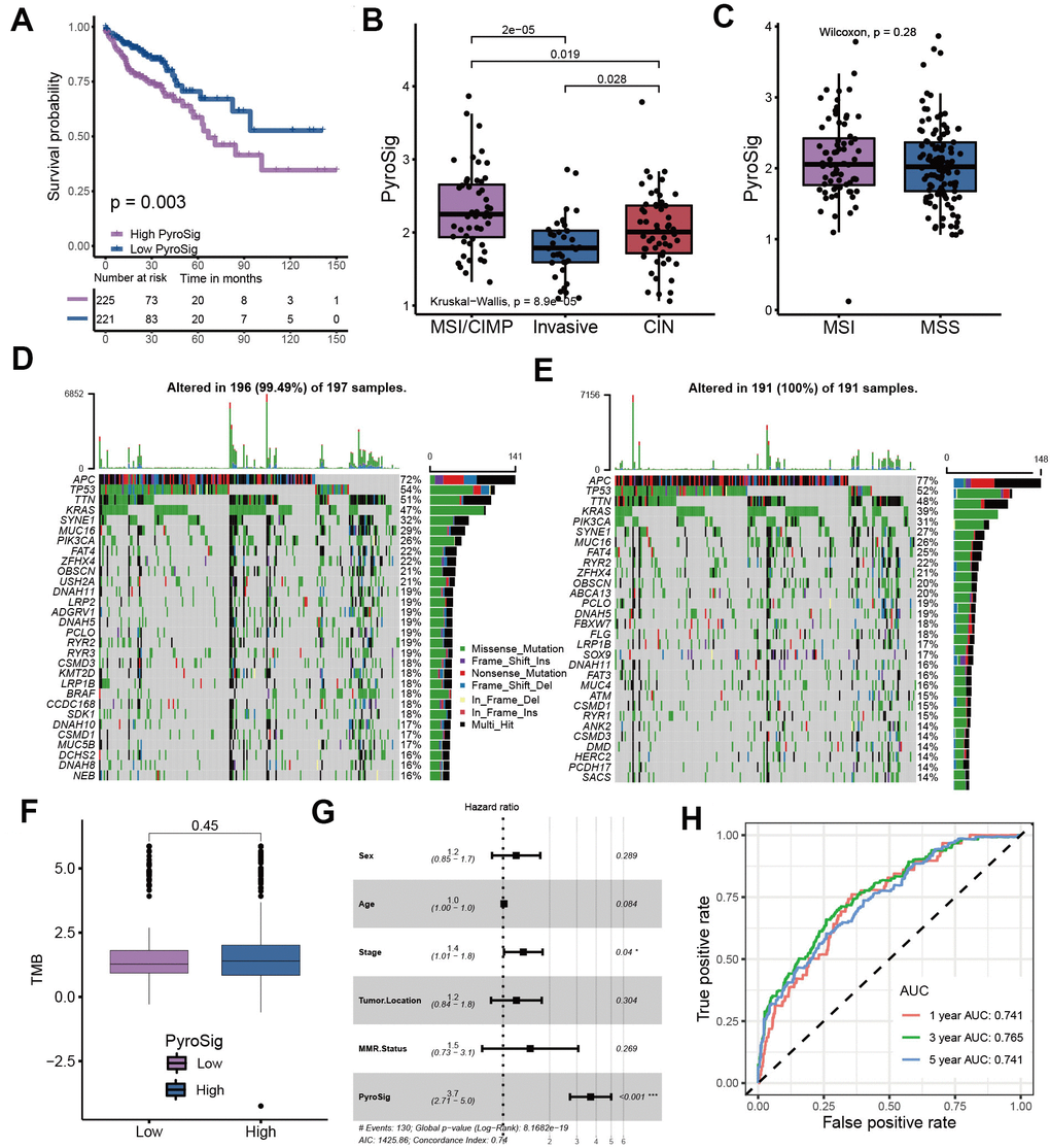 We used TCGA-COAD cohort as the validation set. Consistent with the GEO cohort, patients with low PyroSig also experienced an improved overall survival compared to those with high PyroSig (Figure 5A). Compared with CIN and invasive molecular subtype, patients with MSI/CIMP exhibited a relatively higher PyroSig (Figure 5B). However, we found MSI and MSS phenotype did not show an obvious difference (Figure 5C). We then explore the somatic mutation landscape of the high and low PyroSig group to reveal the correlation between tumor mutation burden and PyroSig (Figure 5D–5F). The tumor mutation burden (TMB) in tumors with low PyroSig were similar with those with high PyroSig (Figure 5F). We plotted the frequency of mutations as well as the types of mutations in the top 30 mutated genes between high and low PyroSig group using waterfall plots (Figure 5D, 5E). Based on the multivariate Cox regression model consisting of sex, age, tumor location and MMR status, we confirmed that the PyroSig was an independent and robust prognostic biomarker to predict the outcomes of patients with colon cancer (Figure 5G). Additionally, the predictive performance of PyroSig signature to evaluate the one, three and five year survival rates, confirmed by the ROC curves, reached 0.741, 0.765 and 0.741, whose reliability was far superior to the traditional pathological evaluation (Figure 5H).