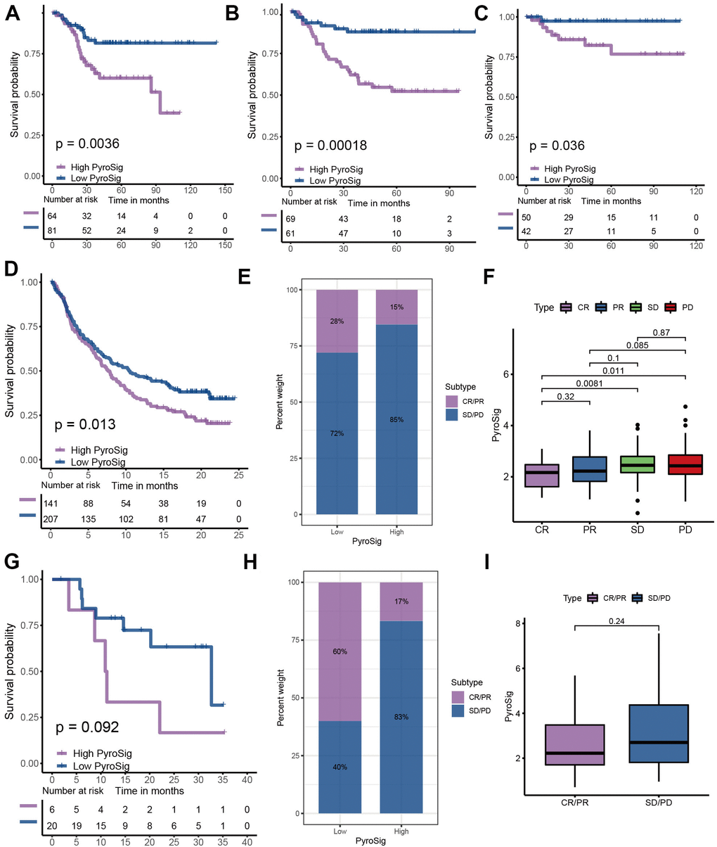 To further determine the prognostic predictive value of the PyroSig signature, we generalized it to other colon cancer cohorts. Based on the GSE17536, GSE37892 and GSE38832 collected from GEO database, we found that patients with lower PyroSig were consistently associated with improved survival compared with those with higher PyroSig, which further confirmed the potential of PyroSig signature as an independent prognostic biomarker in colon cancer (Figure 6A–6C). The successful application of immunotherapy on multiple solid tumors, represented by immune checkpoint inhibitors, has provided a new strategy for the comprehensive treatment of colon cancer. In this study, we collected two immunotherapy cohorts to evaluate the role of PyroSig signature in predicting the efficacy of anti-PD-1/PD-L1 immunotherapy. In the IMvigor210 cohort, which investigated the efficacy of anti-PD-L1 regimens, we found the patients with low PyroSig presented a prominent improved clinical response and survival than patients with high PyroSig (Figure 6D–6F). Consistent with anti-PD-L1 regimens, PyroSig signature could be also used to predict the outcomes of patients treated with anti-PD-1 regimens (Figure 6G, 6H). The above results showed a potential predictive value of PyroSig in anti-PD-1/PD-L1 immunotherapy.