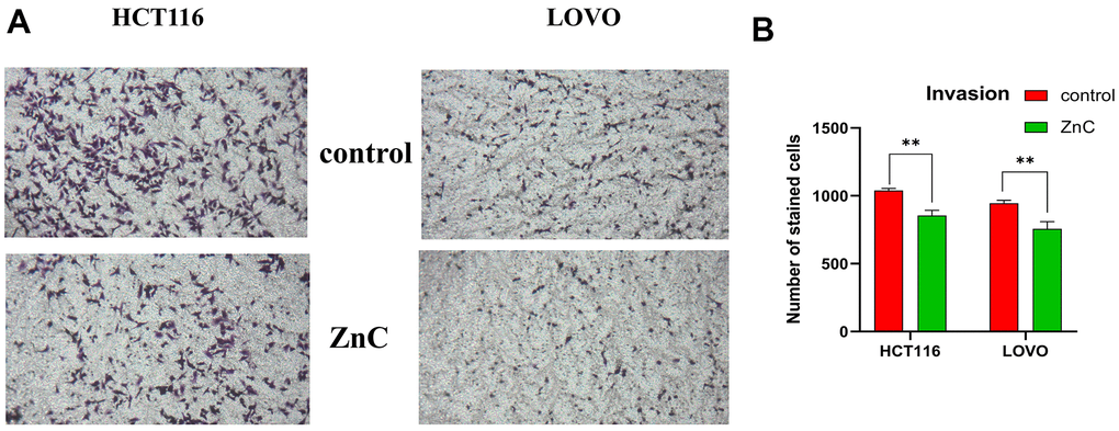 HCT116 and LOVO cells (3 ×105 cells) were respectively tiled into the upper chamber containing 300μl serum-free medium, with ZnC (10 mM) pretreating for 24h. The transwell chamber was laid with matrix mixtures (BD Biosciences, USA) for the invasion tests. We used 600μl complete medium with 10% FBS to fill the bottom cavity, which is a chemical attractant specific to CRC cells. Following 24-hour incubation, the cells invading the outer membrane underwent 10 minutes of fixing treatment in 4% paraformaldehyde, followed by 15 min of staining using Crystal Violet Staining Solution (Beyotime, China). Subsequently, the stained cells were photographed under the microscope and counted for analysis.