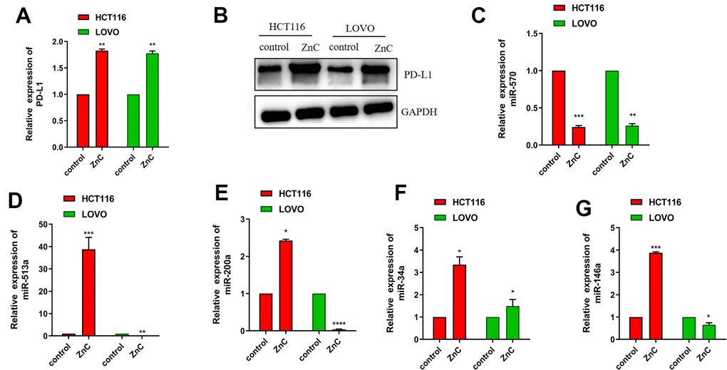 To determine how ZnC affect the tumor immune microenvironment, we examined PD-L1 expression, which is one of the most popular target for immunotherapy currently. We surprisingly found that ZnC resulted in an increase in the PD-L1 mRNA and protein expression in CRC cells by virtue of qRT-PCR assay together with western blot (Figure 4A, 4B). The study held the purpose of confirming factors that impacted the PD-L1 increment in CRC cells due to ZnC. qRT-PCR assisted in investigating miR-570, miR-513a, miR-200a, miR-34a, and miR-146a (miRNAs) expression regarding CRC cells cultured with ZnC or PBS and results demonstrated the down regulation of miR-570 expression in HCT116 as well as LOVO cells, whereas expression of miR-513a, miR-200a, miR-34a, and miR-146a was inconsistent in the two cell lines (Figure 4C–4G). These results demonstrated that ZnC might prevent human CRC cells regarding the proliferation, invasion as well as migration, meanwhile up-regulating PD-L1 expression through down-regulating miR-570 expression.