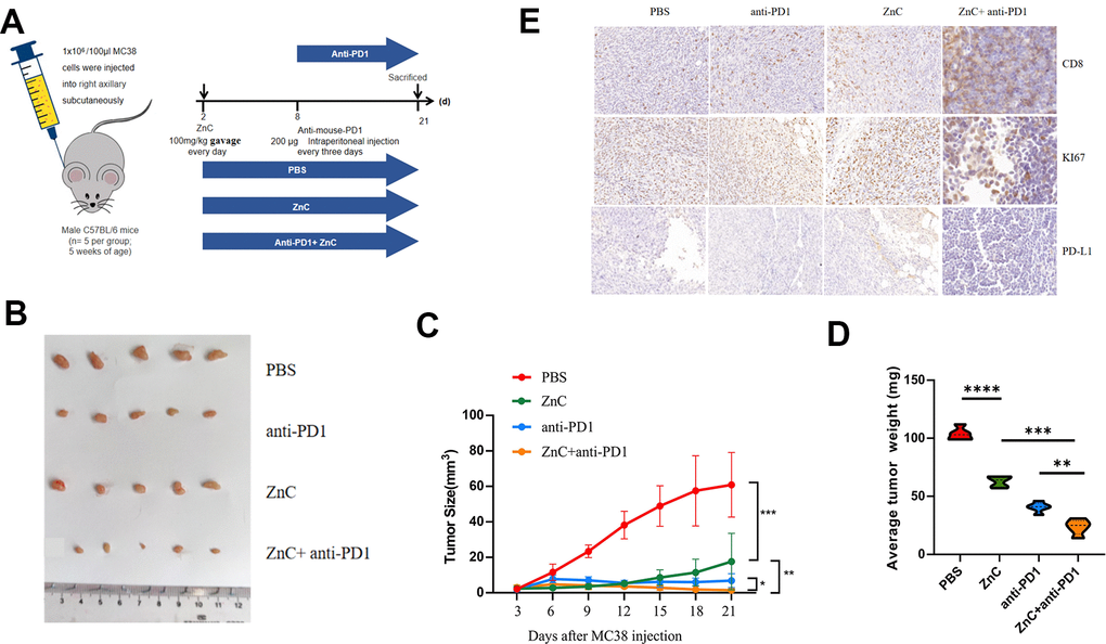 Animal experiments are completed with the approval of the Animal Management Committee of Nanjing Medical University, and all experimental procedures and animal care conform to the institutional ethics of animal experiments. Twenty male C57BL/6 mice (5 weeks old) came from the Experimental Animal Center of Nanjing Medical University and reared under the specific pathogen free (SPF) conditions. For building subcutaneous tumor-bearing mouse model, C57BL/6 mice received subcutaneous inoculation with 1×106 murine MC38 cells mixed in 100μl PBS in the right axillary region. After that, every 5 mice were randomly assigned to one group. Different groups were as follows: PBS, ZnC, anti-PD1, and anti-PD1+ZnC. On the second day, ZnC (100 mg/kg, once every day) was gavaged into the mice in the ZnC and anti-PD1+ZnC groups. After 8 days, the mice in anti-PD1 and anti-PD1+ZnC groups underwent intraperitoneal injection with 200ug anti-mouse-PD1 (BE0273; Bio X Cell, USA) every three days. We measured the tumor size each 3 days and calculated the tumor volume based on the formula: volume (mm3) = width2 × length/2. On day 21, we killed the mice using cervical dislocation, and examined the tumor samples for further analysis (Figure 5A).