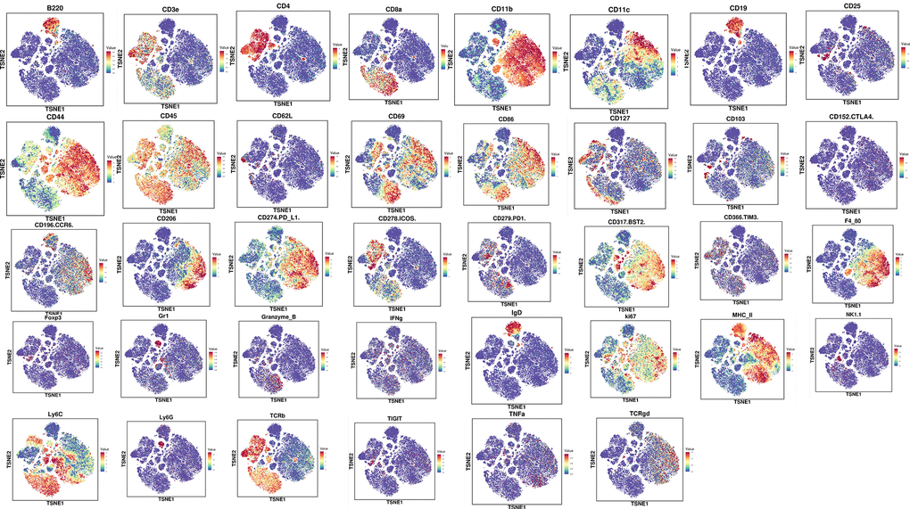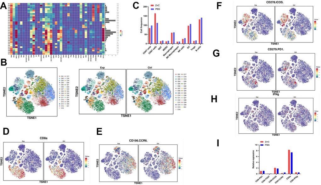 To further assess the overall immune microenvironment changes of CRC tumors in the PBS and ZnC groups, we measured the expression of immune cell clusters in each group using mass cytometry. There are 31 cell clusters, and we define each cluster based on specific markers for each cell type (Figures 6, 7A, 7B). The results showed that immunosuppressive cells including regulatory T cells (tregs), bone marrow-derived suppressor cells (MDSC), as well as M2 macrophages decreased whereas CD8+ T cells after ZnC addition (Figure 7C). Additionally, we assessed the overall expression of CD8+ PD1, CD8+ TIGIT, CD8+ CCR6, CD8+ IFNg and CD8+ ICOS in the immune microenvironment. Hence, after the addition of ZnC, CD8+ CCR6 noticeably decreased whereas CD8a and CD8+ ICOS expression increased (Figure 7D–7I). The mentioned results suggested that injection of ZnC could lead to the increase of CD8+ T cells expression, while reducing the immunosuppressive cell number in CRC.