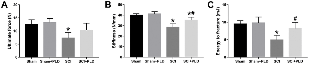 High-resolution μCT was also used to evaluate the effect of PLD on the cortical bone structure in the femur midshaft. The cortical BMD of all 4 groups was similar 16 weeks after surgery (data not shown). However, the SCI mice had thinner bones and reduced total area, bone area, and medullary area compared to the sham-operated group (Figure 3B), resulting in a slight decrease in Ct.Th (Figure 3E). Interestingly, both Ct.BV/TV (+ 16.1% vs. SCI; Figure 3D) and Ct.Th (+ 42.2% vs. SCI; Figure 3E) were significantly increased in the PLD-treated SCI animals due to a moderate increase in periosteal perimeter (+ 10.9% vs. sham; Figure 3C), as well as significant reductions in medullary area (- 16.6% vs. sham; Figure 3B) and endosteal perimeter (- 16.5% vs. SCI; Figure 3C). The femoral diaphysis of the SCI mice had significantly lower ultimate force and stiffness, and required less energy to fracture compared to that of the sham-operated group (Figure 4). PLD treatment significantly improved the mechanical properties of the bones of SCI mice. However, 8 weeks of PLD treatment had no significant effect on the bone geometry, microstructure and mechanical properties of sham-operated mice.