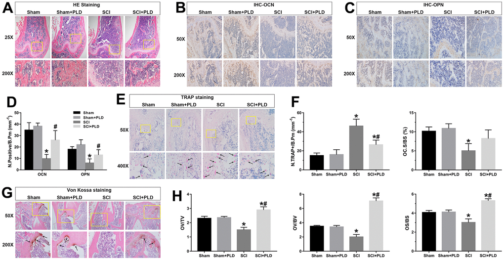 As shown in Figure 5B–5D, the in-situ expression of OCN and OPN was markedly decreased in the vehicle-treated SCI animals, suggesting inhibition of osteoblastic differentiation. PLD treatment improved bone formation in DFM, which was indicated by an increased number of OCN-positive mature osteoblasts and OPN-positive pre-osteoblasts on the bone surfaces. Furthermore, von Kossa/Tetrachrome staining revealed a marginal reduction in osteoid volume (OV/TV and OV/BV) and osteoid surface (OS/BS) in the SCI group compared to the sham-operated group (Figure 5G, 5H), which were substantially elevated after PLD treatment to levels higher than that of the sham-operated mice.