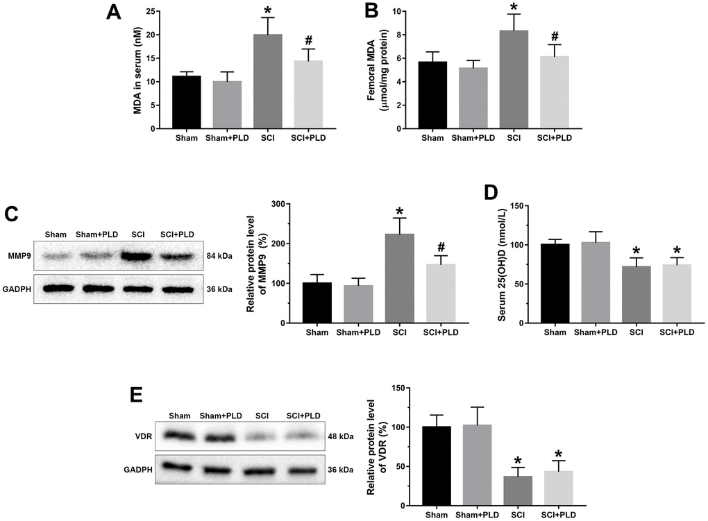 MDA level is an indicator of lipid peroxidation and oxidative stress levels. Compared to the sham-operated mice, the serum and femoral MDA content were higher in the chronic SCI mice (Figure 6A, 6B). PLD supplementation significantly decreased serum and femoral MDA levels, which is consistent with its anti-oxidant effects. Induction of SCI also activated femoral MMP9, which plays a key role in bone resorption (Figure 6C), compared to the control group. Treatment of chronic SCI mice with PLD significantly decreased protein expression of MMP9 in the femur.