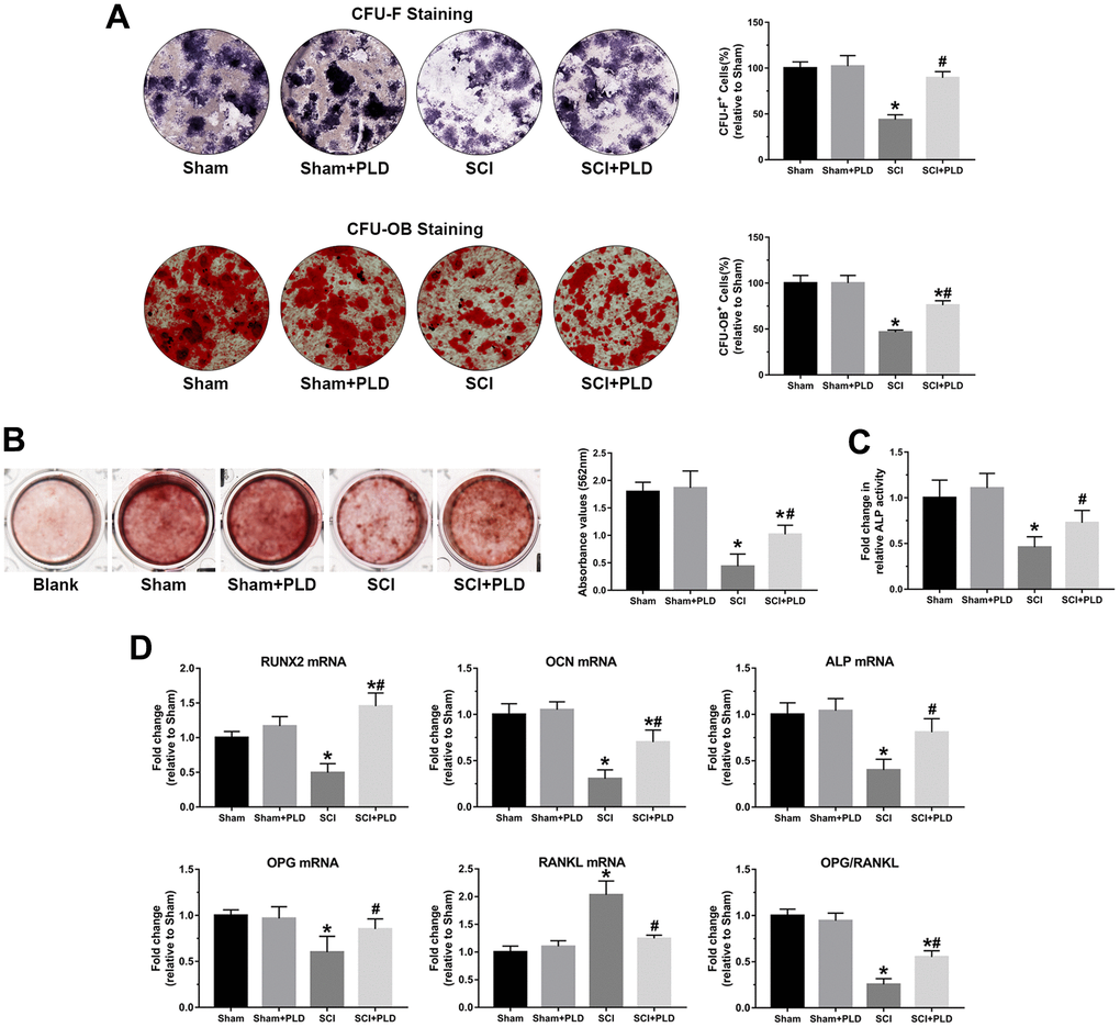 At 16 weeks after SCI induction, a marked reduction was observed in the number of ALP+ osteoblast-like cells (CFU-F), an indicator of the differentiation of bone marrow precursors into the osteoblast lineage (Figure 7A). Similarly, the number of mineralized nodules (CFU-OB) was also significantly reduced in the SCI group (Figure 7A). PLD treatment restored osteoblast differentiation in the affected bones. As shown in Figure 7B, PLD promoted BMSC calcification in animals with chronic SCI, as evidenced by Alizarin red staining. This result was also consistent with the outcome of the quantitative analysis of the ALP activity assay (Figure 7C).