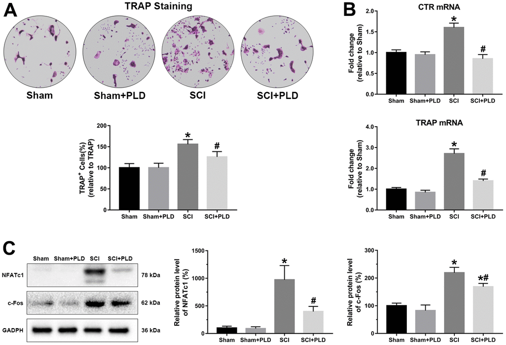 Consistent with this, the osteoclast differentiation markers CTR and TRAP were significantly upregulated by about 60% and 170%, respectively, in osteoclast cultures from animals with chronic SCI. After PLD treatment, the mRNA levels were decreased to levels similar to those detected in vehicle-treated or PLD-treated sham-operated animals (Figure 8B). In addition, the protein expression of osteoclast target genes (NFATc1 and c-Fos) also showed a similar trend (Figure 8C).
