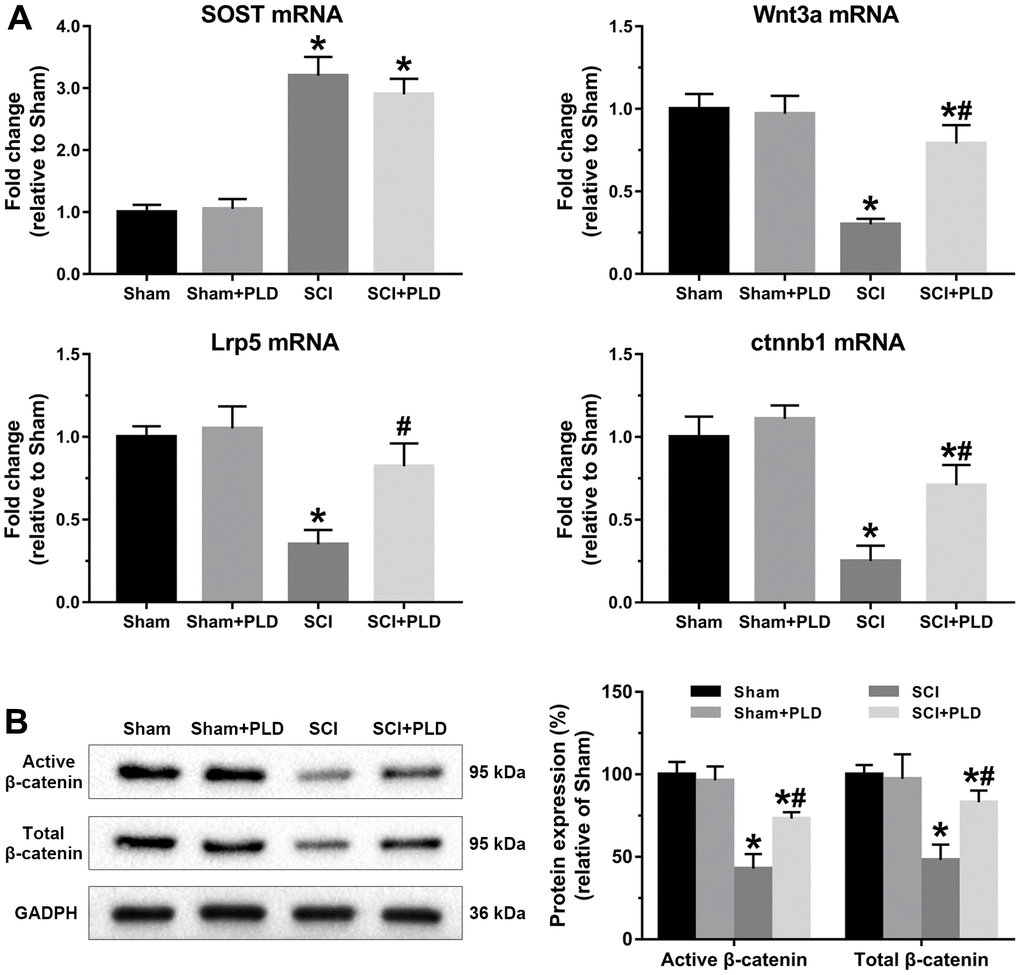Wnt/β-catenin signaling was evaluated by analyzing the femoral levels of SOST, Wnt3a, Lrp5, and ctnnb1 mRNAs. SOST mRNA levels in the chronic SCI mice were approximately 2-fold higher compared to that in the sham-operated group, and unaffected by PLD treatment. Compared to the sham-operated group, Wnt3a, Lrp5, and ctnnb1 mRNAs were significantly downregulated in the SCI group, and restored to varying degrees by PLD (Figure 9A). Strikingly, Lrp5 expression in the PLD-treated SCI group was similar to that of the sham-operated controls. In addition, both the active and total β-catenin protein levels were decreased in the femurs of chronic SCI mice and reversed after PLD treatment (Figure 9B). Taken together, PLD exerted its therapeutic effects against chronic SCI by activating the femoral Wnt/β-catenin signaling.