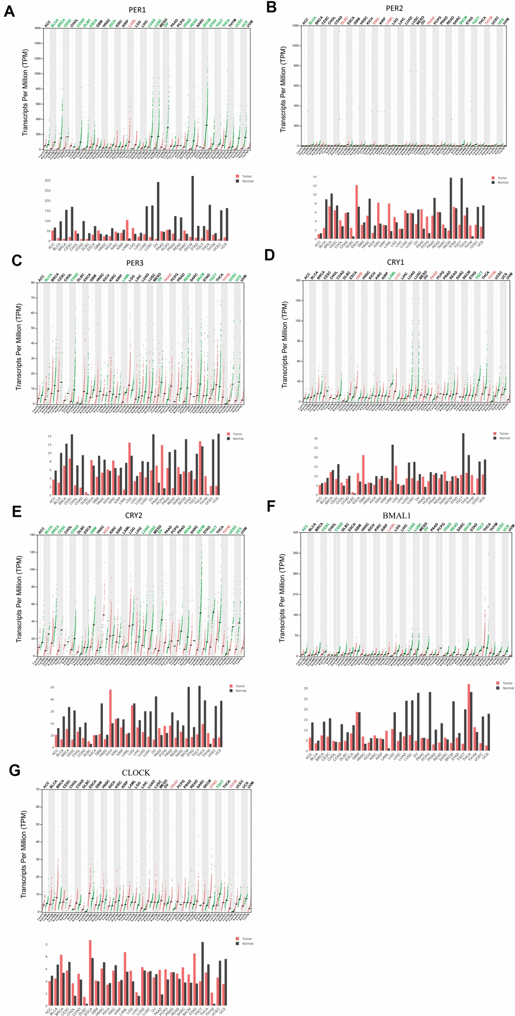 Circadian factors are widely expressed by mammalian cells, but have different expression levels in different tumor tissues. The UALCAN database showed expressions of circadian factors, including PER and CRY family members, BMAL1 (ARNTL), and CLOCK, with differential expression levels between different types of cancers and normal tissues (Supplementary Figure 1). GEPIA was used to understand the messenger (m)RNA expressions of circadian rhythm-related factors in the PER family (PER1, PER2, and PER3), CRY family (CRY1 and CRY2), BMAL1, and CLOCK in different types of cancer (Figure 1).
