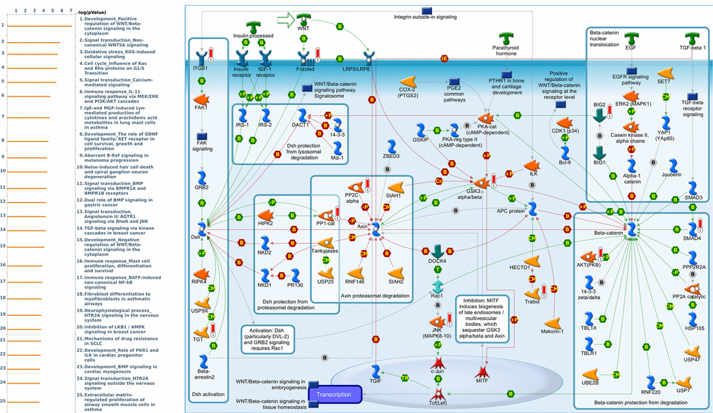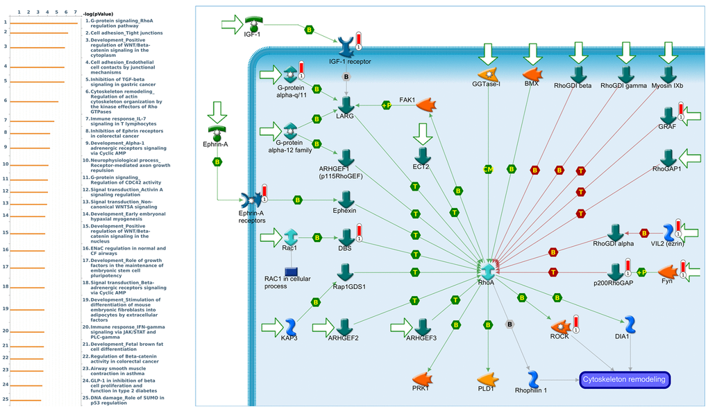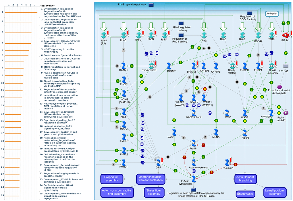 Genes coexpressed with CRY1 were correlated with “Development_Positive regulation of WNT/Beta-catenin signaling in the cytoplasm”, “Signal transduction_Non-canonical WNT5A Signaling”, and “Oxidative stress_ROS-Induced cellular signaling” (Figure 10 and Supplementary Table 6). Genes coexpressed with CRY2 were correlated with “Cytoskeleton remodeling_Regulation of actin cytoskeleton nucleation and polymerization by Rho GTPases”, “Development_Regulation of lung epithelial progenitor cell differentiation”, and “Cytoskeleton remodeling_Regulation of actin cytoskeleton organization by the kinase effectors of Rho GTPases” (Figure 11 and Supplementary Table 7).