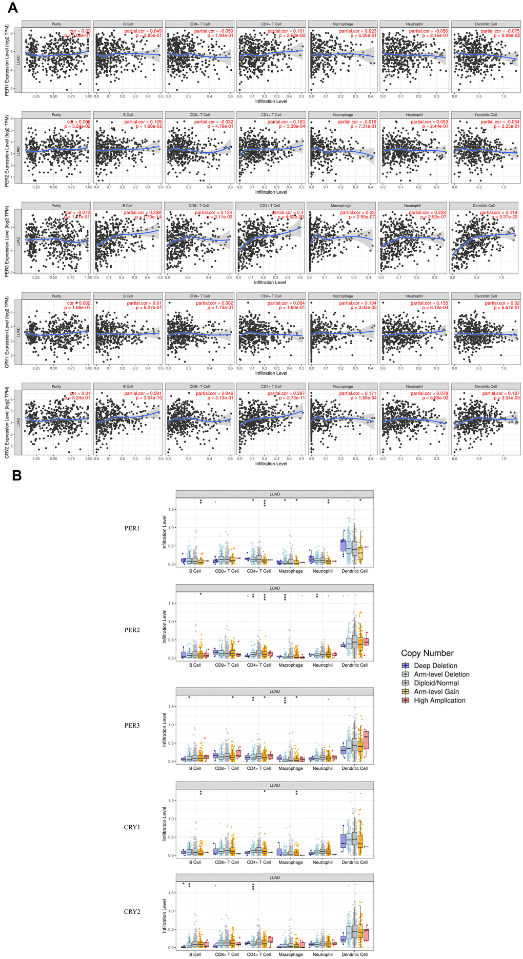 In addition, somatic copy number alterations (CNAs) of circadian factors were significantly associated with infiltration levels (Figure 12B). Among them, CNAs of PER1 affected the infiltration level of B cells, CD4+ T cells, macrophage, neutrophil, and DCs; CNAs of PER2 affected the infiltration levels of B cells, CD4+ T cells, macrophage, and neutrophils; CNAs of PER3 affected the infiltration levels of B cells, CD8+ T cells, CD4+ T cells, and macrophages; CNAs of CRY1 affected the infiltration levels of B cells, CD4+ T cells, and macrophages; and CNAs of CRY2 affected the infiltration levels of B cells and CD4+ T cells. These results demonstrated that genetic alterations of the PER and CRY families in LUAD led to changes in immune infiltration levels.