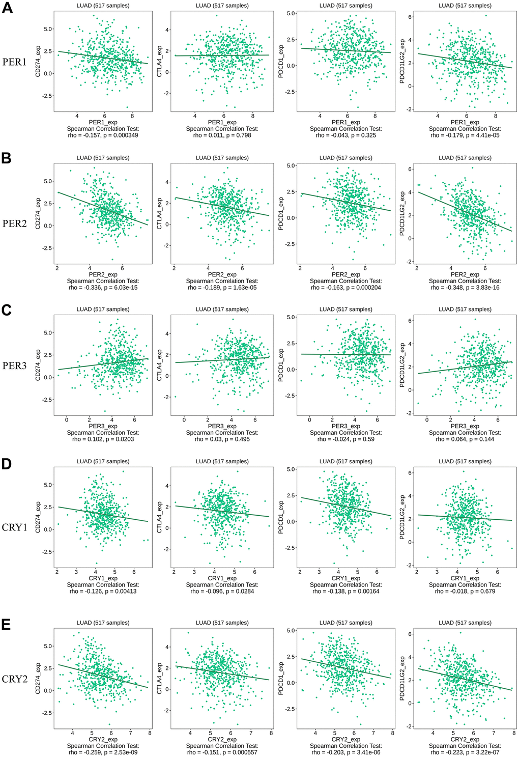 Our results correspond to other research in immunotherapy [74]. PER1 and CRY2 were correlated with the expression of CD4+ T cells, and the expression of PD-1 exhibited a robust circadian rhythm in normal lung tissues [75], which supported the results that circadian rhythm factors might downregulate expressions of immune checkpoint factors and thus enhance the effects of immunotherapy in LUAD. Although there is a lack of further evident clinical data to prove our hypothesis, we propose a positive association between circadian rhythm factors and immunity.