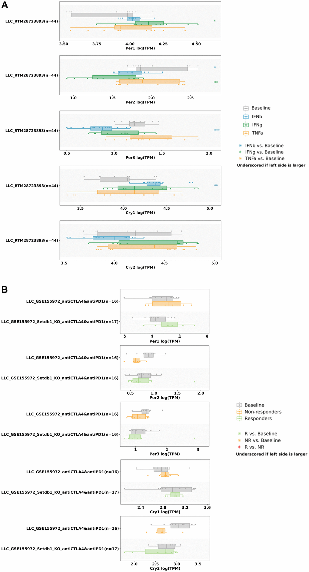 We also utilized the TISIDB database to understand relationships between various immune checkpoints and circadian factors (Figure 13). The results showed that the expression of PER1 was correlated with CD274 (rho = -0.157, p = 0.000349) and PDCD1LG2 (rho = -0.179, p = 4.41E-05) (Figure 13A); the expression of PER2 was correlated with CD274 (rho = -0.336, p = 6.03E-15), CTLA4 (rho = -0.189, p = 1.63e-05), PDCD1 (rho = -0.163, p = 0.000204), and PDCD1LG2 (rho = -0.348, p = 3.83e-16) (Figure 13B); the expression of PER3 was correlated with CD274 (rho = 0.102, p = 0.0203) (Figure 13C); the expression of CRY1 was correlated with CD274 (rho = -0.126, p = 0.00413), CTLA4 (rho = -0.096, p = 0.0284), and PDCD1 (rho = -0.138, p = 0.00164) (Figure 13D); and the expression of CRY2 was correlated with CD274 (rho = -0.259, p = 2.53E-09), CTLA4 (rho = -0.151, p = 0.000557), PDCD1 (rho = -0.203, p = 3.41E-06), and PDCD1LG2 (rho = -0.223, p = 3.22e-07) (Figure 13E). Finally, we used the TISMO database to recognize whether the expressions of circadian factors were affected by different immunotherapies (Figure 14). Expressions of circadian rhythm factors in an LLC (lung carcinoma) cancer model changed under stimulation with different cytokines (Figure 14A). However, the expressions of these circadian factors were not significantly affected under different immune checkpoint blockade treatments (Figure 14B).