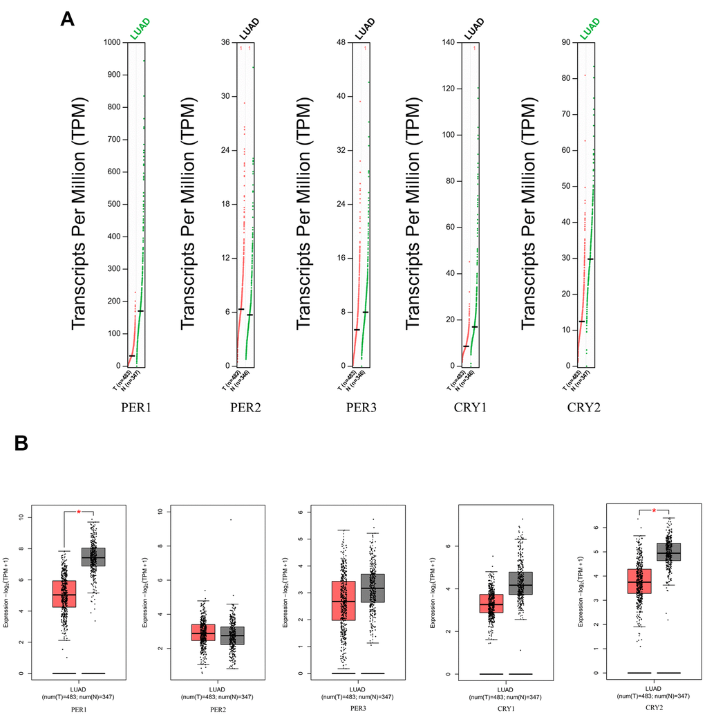 In summary, we used several high-throughput bioinformatics databases to analyze and investigate gene expressions of PER and CRY family members and their influences. The present study may help us better understand the molecular functions of circadian rhythm-related factors in LUAD and may provide possible molecular targets for LUAD in chemotherapy and immunotherapy.