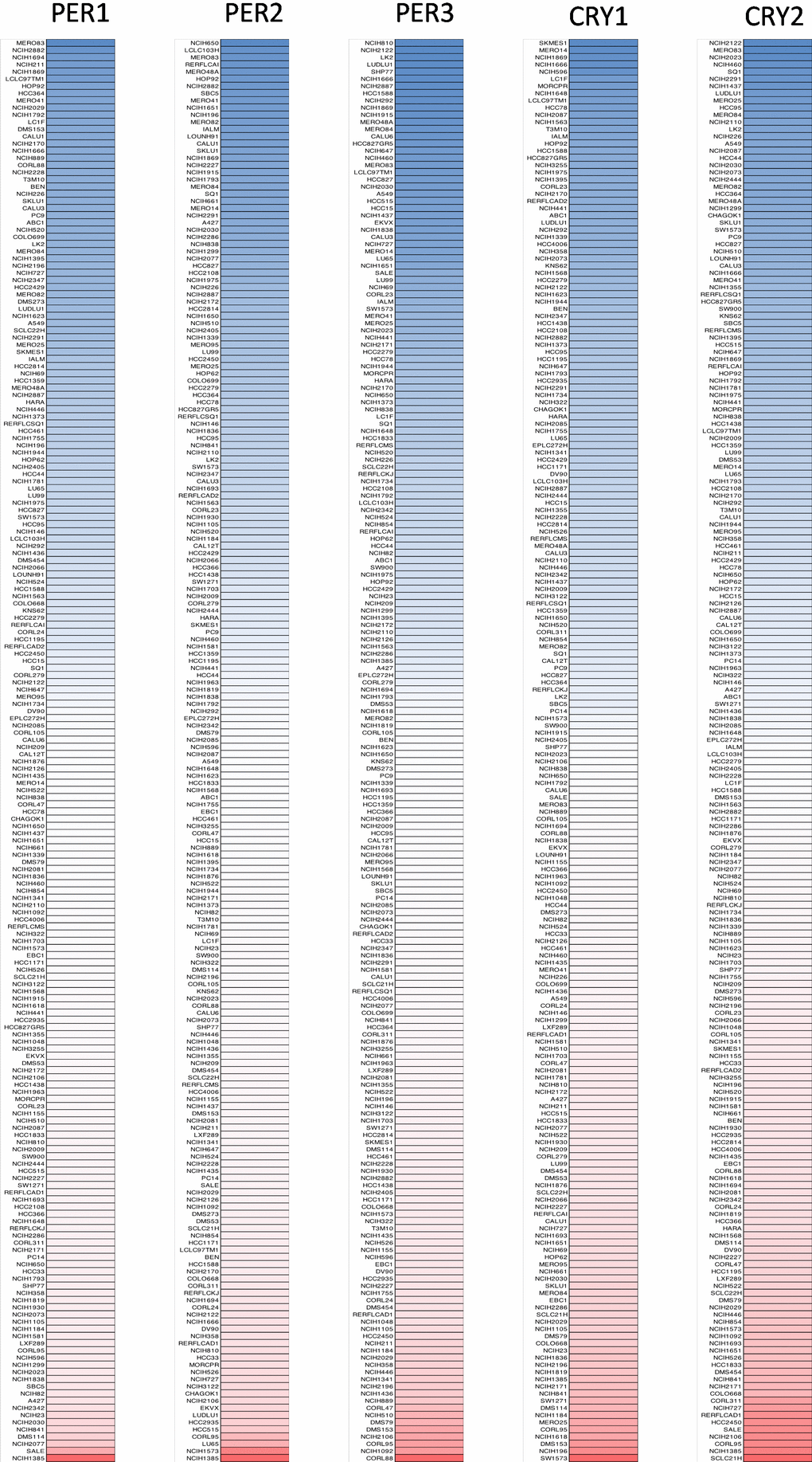 Furthermore, we used the CCLE to analyze mRNA expression levels of PER1, PER2, PER3, CRY1, and CRY2 in lung cancer cell lines in current lung cancer research. Then, the CCLE analysis was presented to reveal transcriptomic levels of PER and CRY family members in 198 lung cancer cell lines (Figure 3). Comprehensive results are clearly described in Figure 3 and show mRNA expression levels of PER1, PER2, PER3, CRY1, and CRY2 in different lung cancer cell lines. Blue represents a lowly expressed gene in a cell line, while red indicates a highly expressed gene in a cell line. The shade of the color represents the degree of high or low expression.