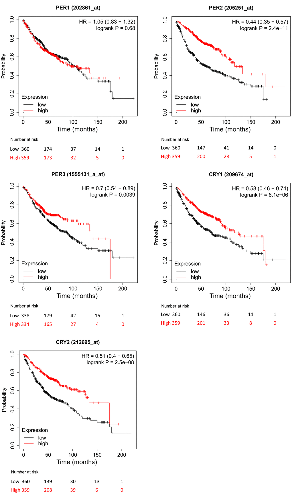 The KM plotter (https://kmplot.com/analysis/), an online database with gene expression and clinical data, can be used to analyze relationships between gene expressions and cancer survival rates. Types of cancer that can be analyzed include lung cancer [85], breast cancer [86], ovarian cancer [87], gastric cancer [88], liver cancer [89] and pan-cancer [90]. We used this tool to understand prognostic values of expression levels of the circadian rhythm-related PER1, PER2, PER3, CRY1, and CRY2 genes in lung cancer patients and analyzed the OS of lung cancer patients under expressions of related genes, as well as the number of patients, median values of messenger (m)RNA expressions, 95% confidence intervals (CIs), hazard ratios (HRs), p values, and other related information.
