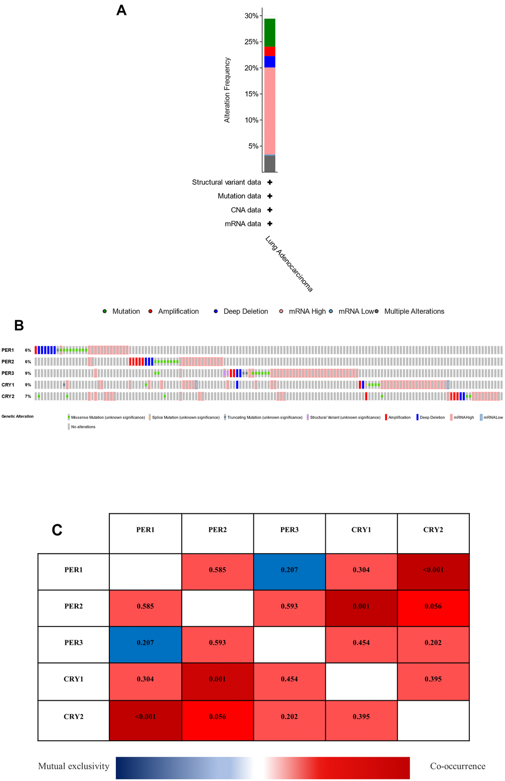 Analysis of genetic changes and coexpressions of PER and CRY family proteins in LUAD patients
