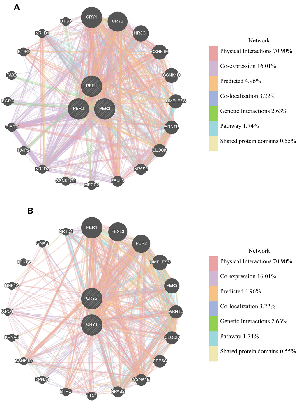 DAVID was utilized to analyze molecular functions and Online Mendelian inheritance in man (OMIM) diseases of PER1-, PER2-, PER3-, CRY1-, and CRY2-related genes (Supplementary Table 2). The first five molecular functions of PER1 (Supplementary Table 2A) were protein binding, ATP binding, microtubule-binding, single-stranded DNA binding, and microtubule motor activity. As to OMIM diseases, PER1 was related to breast cancer and colorectal cancer (Supplementary Table 2B). The first five molecular functions of PER2 (Supplementary Table 2C) were protein binding, poly(A) RNA binding, single-stranded DNA binding, microtubule binding, and chromatin binding. As to OMIM diseases, PER2 was related to skin/hair/eye pigmentation 1, blond/brown hair, skin/hair/eye pigmentation 1, blue/non-blue eyes (Supplementary Table 2D). The first five molecular functions of PER3 (Supplementary Table 2E) were protein binding, poly (A) RNA binding, MHC class II receptor activity, metal ion binding, and structural constituents of ribosomes. As to OMIM diseases, PER3 was related to congenital dysfibrinogenemia and congenital afibrinogenemia (Supplementary Table 2F). The first five molecular functions of the CRY family (Supplementary Table 2G) were protein binding, single-stranded DNA-dependent ATPase activity, protein kinase binding, DNA clamp loader activity, and ATP binding [41–45]. Results demonstrated the proportions of related genes with protein-binding function were the highest with statistical significance among these five genes. Moreover, we used STRING database to separately analyze PPIs of PER and CRY family members. Supplementary Figure 4 shows the protein networks closely related to the PER (Supplementary Figure 4A) and CRY families (Supplementary Figure 4B).