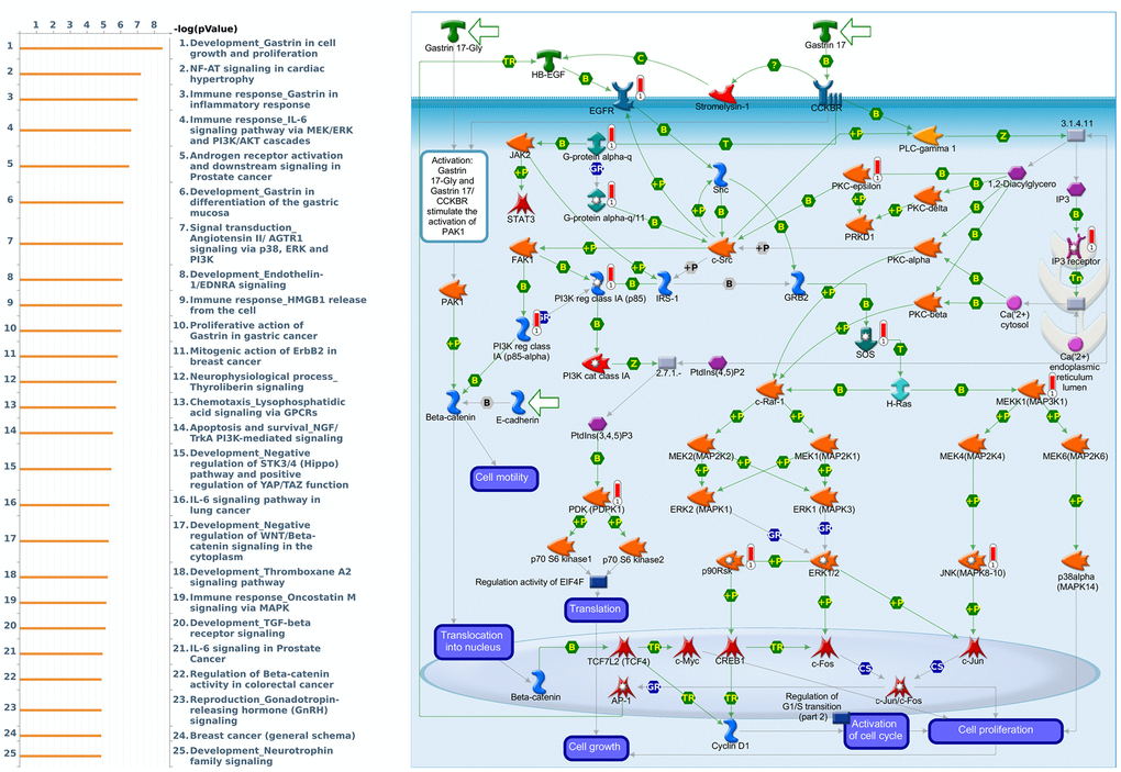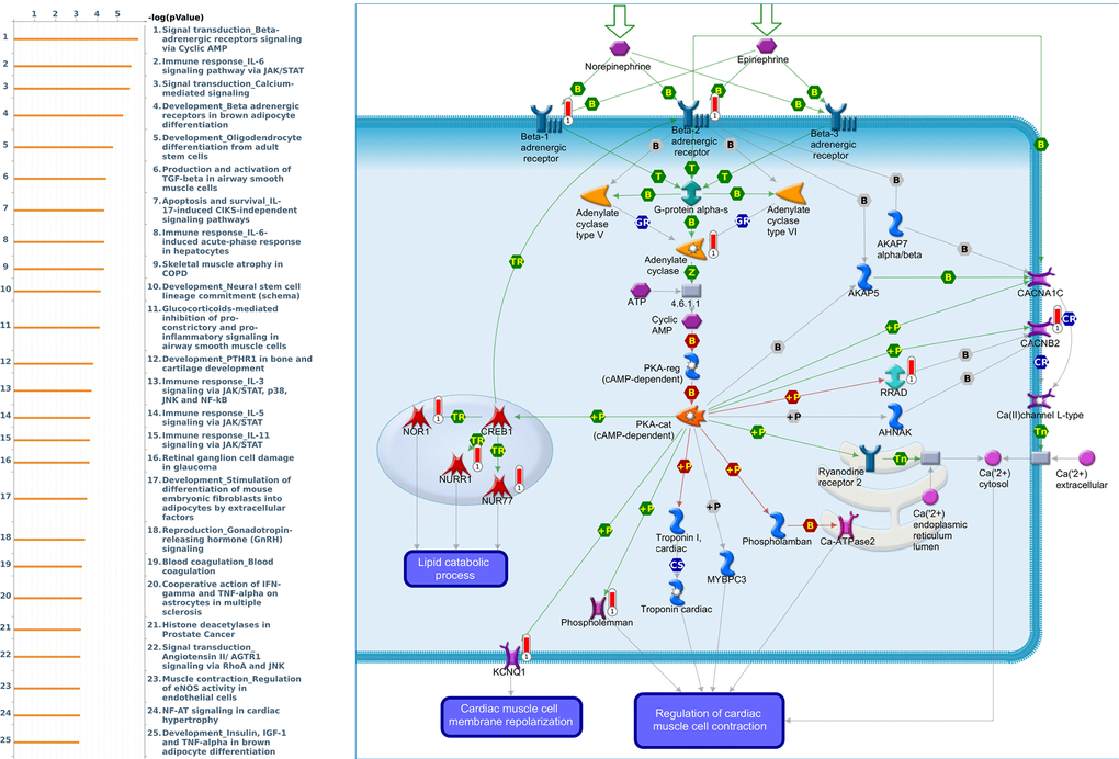 Genes coexpressed with PER1 were correlated with “Signal transduction_Beta-adrenergic receptors signaling via cyclic AMP”, “Immune response_IL-6 signaling pathway via JAK/STAT”, and “Signal transduction_Calcium-mediated signaling” (Figure 7 and Supplementary Table 3). Genes coexpressed with PER2 were correlated with “G-protein signaling_RhoA regulation pathway”, “Cell adhesion_Tight junctions”, and “Development_Positive regulation of WNT/Beta-catenin signaling in the cytoplasm” (Figure 8 and Supplementary Table 4). Genes coexpressed with PER3 were correlated with “Development_Gastrin in cell growth and proliferation”, “NF-AT signaling in cardiac hypertrophy”, and “Immune response_Gastrin in inflammatory response” (Figure 9 and Supplementary Table 5).