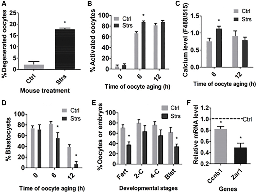 To examine the impacts of FRSOD on fertilization and developmental competence of postovulatory aging oocytes, oocytes were recovered at different intervals following ovulation and were either Sr2+-activated or fertilized to observe embryo development, or measured by RT-qPCR for mRNA levels of the developmental competence-related genes. Following Sr2+-activation, blastocyst rates in 0 h-aged oocytes were high and not different between the control and stressed groups. However, the blastocyst rates in both 6 h- and 12 h-aged oocytes were lower significantly in stressed than in control groups (Figure 1D). Rates of both fertilization and blastulation were lower significantly in stressed oocytes than in control oocytes when insemination was performed 12 h after ovulation (Figure 1E). Proportions of 2-cell embryos and 4-cell embryos in 12 h-aged oocytes were lower as well in stressed mice than in control mice, although the difference did not reach significant levels statistically. Furthermore, expression of the development-beneficial genes, cyclin B1 (Ccnb1) and zygote arrest 1 (Zar1), was downregulated significantly in stressed oocytes compared to that in control ones following 12-h aging (Figure 1F). Taken together, the data suggest that FRSOD significantly impaired fertilization and developmental competence of POA oocytes.