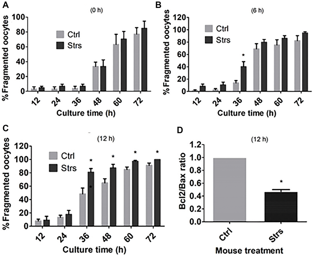 To examine the impacts of FRSOD on ooplasmic fragmentation and apoptosis of POA oocytes, oocytes that were recovered at different time intervals following ovulation were incubated in CZB medium, and ooplasmic fragmentation was observed at different hours during the incubation. Fragmentation percentages of the 0 h-aged oocytes did not differ between control and stressed groups when observed at any time points during the culture (Figure 2A). Fragmentation percentages in the 6 h-aged oocytes were higher significantly in stressed groups than in control groups when observed at 36 h of the culture, but the difference between the two groups became insignificant afterwards (Figure 2B). The percentages of fragmentation in 12 h-aged oocytes were higher significantly in stressed mice than in control mice when observed from 36 h to 72 h of the incubation (Figure 2C). Furthermore, the Bcl2/Bax ratio in 12 h-aged oocytes was lower significantly in stressed mice than in control mice (Figure 2D). Thus, the results suggest that FRSOD facilitated cytoplasmic fragmentation and apoptosis of postovulatory aging oocytes.