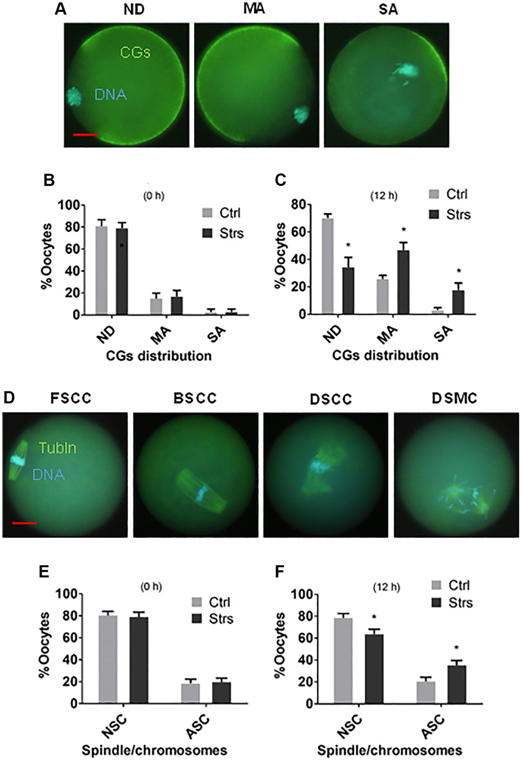 The morphology of spindle/chromosome was categorized into the focused pole spindle (FS), the barrel-shaped pole spindle (BS) or the disintegrated spindle (DS) with congressed chromosomes (CC) or misaligned chromosomes (MC) (Figure 3D). While FS or BS with CC were considered as normal spindle/chromosome morphology, DS with CC or MC were considered as abnormal spindle/chromosome morphology. In 0 h-aged oocytes, neither percentages of oocytes with normal nor those with abnormal spindle/chromosomes differed significantly between stressed and control groups (Figure 3E). In 12 h-aged oocytes, however, while percentages of oocytes with normal spindle/chromosomes were lower, those with abnormal spindle/chromosomes were higher significantly in stressed mice than in control mice (Figure 3F). The results indicate that FRSOD significantly worsened the disorganization of CGs and spindle/chromosomes during mouse oocyte POA.