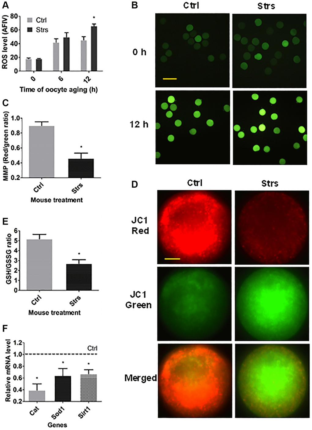 To study the impacts of FRSOD on redox potential in POA oocytes, oocytes that had been recovered at 0 h and/or 12 h following ovulation were measured for reactive oxygen species (ROS), mitochondrial membrane potential (MMP), GSH/GSSG ratio, and expression of antioxidant genes. In both 0 h- and 6 h- aged oocytes, the ROS level was not different significantly between the stressed group and the control group (Figure 4A and 4B). In 12 h-aged oocytes, however, the level of ROS in stressed mice was higher significantly than that in control mice. Both the MMP (Figure 4C and 4D) and the GSH/GSSG ratio (Figure 4E) of the 12 h-aged oocytes were lower significantly in stressed mice than in control mice. Furthermore, expression of the three antioxidant enzymes examined in 12 h-aged oocytes, including catalase (Cat), superoxide dismutase 1 (Sod1) and sirtuin 1 (Sirt1), was downregulated significantly in stressed group than that in control group (Figure 4F). The data indicate that FRSOD significantly impaired redox potential leading to increased oxidative stress in postovulatory aged oocytes.
