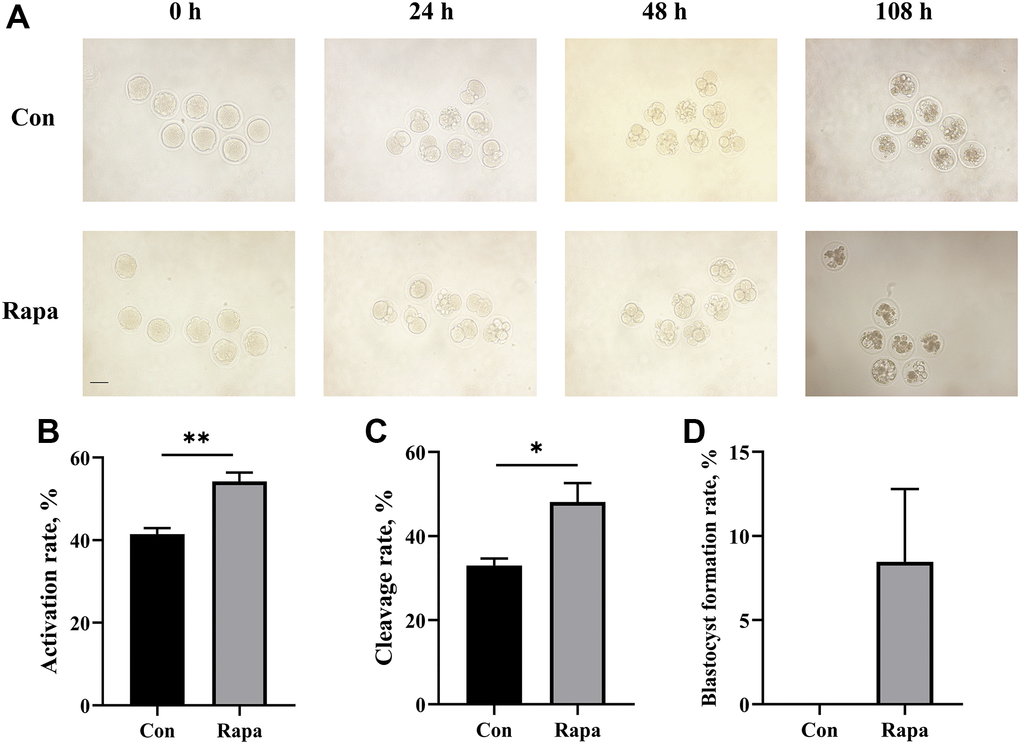 On average, the number of immature oocytes retrieved per mouse (aged 40~48 weeks) was 18.3 ± 1.5. After IVM, the maturation rates of oocytes in the rapamycin group were significantly higher than those in the control group (85.8% ± 3.0% vs. 74.7% ± 1.9%, P = 0.035). Following parthenogenetic activation (PA), the activation rates, cleavage rates, and blastocyst formation rates in the rapamycin group were also increased to some extent, compared with those in the control group (activation rate: 54.2% ± 2.2% vs. 41.5% ± 1.5%, P = 0.008; cleavage rate: 48.1% ± 4.5% vs. 33.0% ± 1.7%, P = 0.034; blastocyst formation rate: 8.5% ± 4.3% vs. 0.0% ± 0.0%, P = 0.122), as shown in Figure 1.