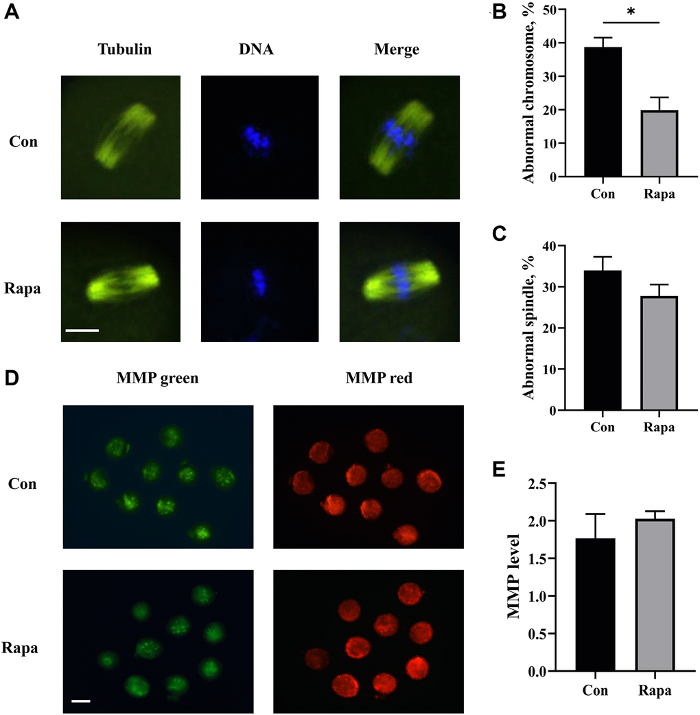 The quality of IVM oocytes was assessed from three aspects: spindle structure, chromosome arrangement, and mitochondrial activity. As shown in Figure 2, the rates of abnormal chromosome alignment in the oocytes of the rapamycin group were significantly reduced, compared with those in the control group (19.9% ± 3.8% vs. 38.7% ± 2.8%, P = 0.016). No significant difference in the abnormal rates of spindle morphology was observed between the two groups (27.8% ± 2.8% vs. 34.0% ± 3.3%, P = 0.224). Moreover, the levels of mitochondrial membrane potential (MMP) in the oocytes were also evaluated. The MMP levels slightly increased in oocytes of rapamycin group, compared with those of control group (2.0 ± 0.1 vs. 1.8 ± 0.3), yet without statistical significance (P = 0.485).