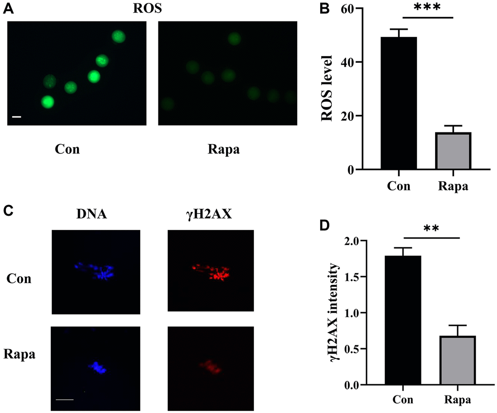 Rapamycin markedly reduced the ROS levels and rescued DNA damage in IVM oocytes from aged mice
