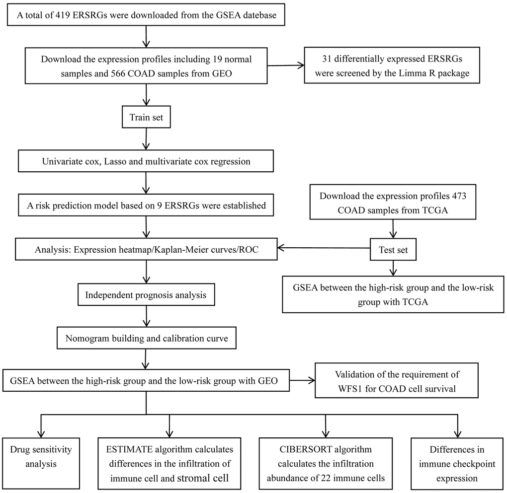Herein, we built a prognostic model relied on ERSRGs for COAD and validated it in an external dataset. Afterwards, we explored the relationship between the ERSRGs signature and infiltration of immune cell in immune microenvironment. At last, we investigated the role of WFS1 in COAD through in vitro experiments.