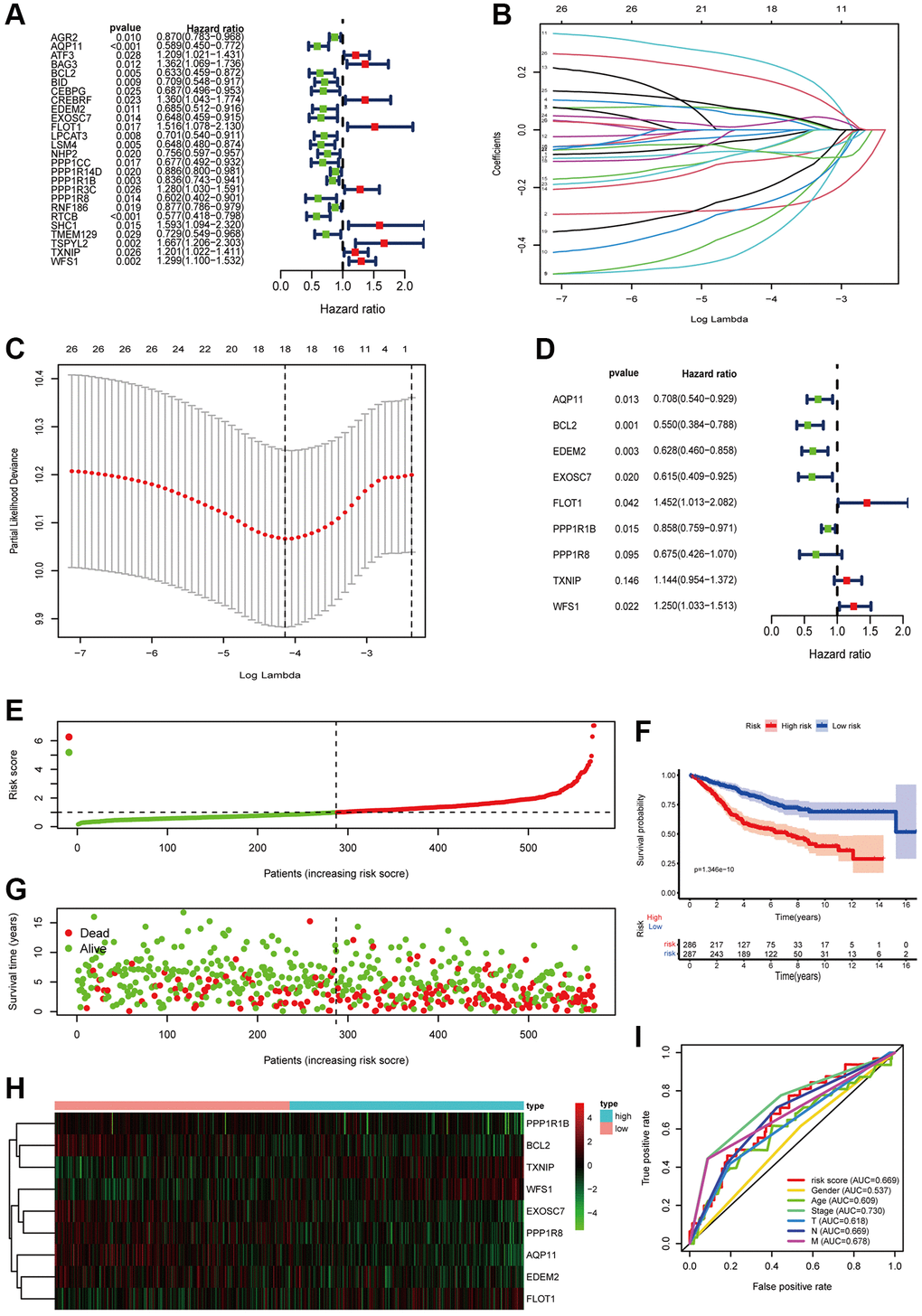 Based on 9 ERSRGs (AQP11, BCL2, EDEM2, EXOSC7, FLOT1, PPP1R1B, PPP1R8, TXNIP, WFS1), we successfully constructed a prognostic risk model that precisely estimate the prognosis of COAD patients. Our findings may offer novel targets for the therapy of COAD patients.