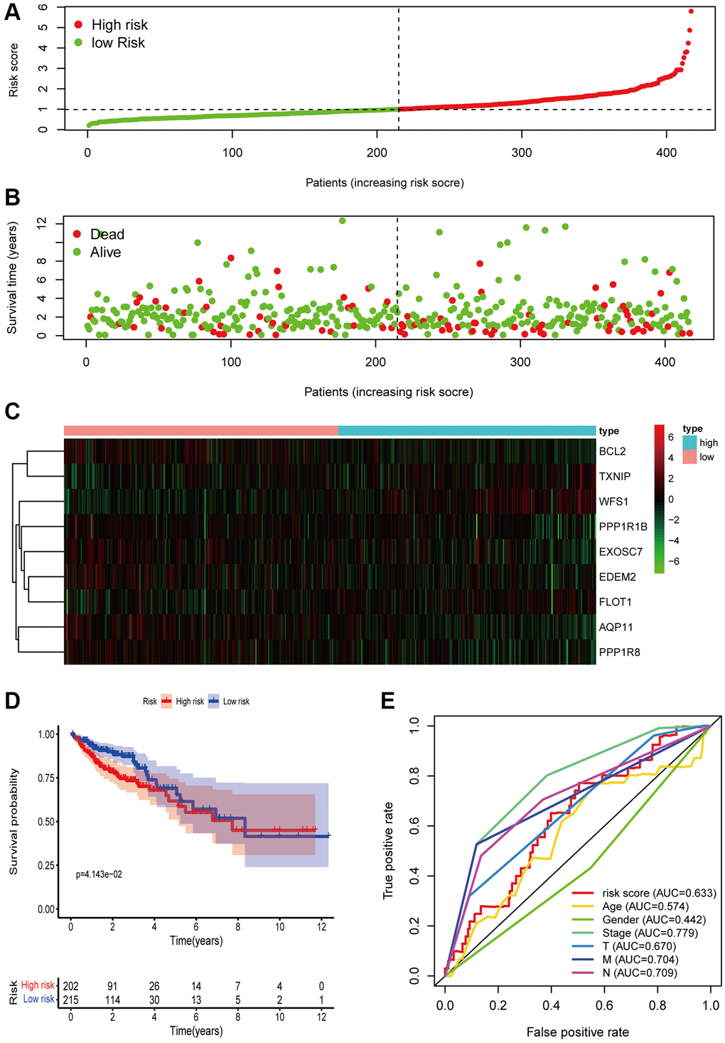 To validate the performance of the prognostic model in independent cohort, we downloaded the gene expression files of patients with COAD from TCGA as the test set. The risk scores of patients from test set were calculated using the same formula. COAD patients from the test set were separated into high-risk (n = 202) and low-risk (n = 215) groups according to the median risk score of the training set as the cutoff point. (Figure 3A). Similar with patients in training set, those with high-risk scores had shorter OS than those with low-risk scores (Figure 3B). The heatmap (Figure 3C) showed expression levels of 9 ERSRGs of each patient in test set. Kaplan-Meier survival curves suggested that COAD patients in the low-risk group had dramatically better prognosis compared with those in the high-risk group (Figure 3D). Our prognostic model had a good predictive performance, with an area under the receiver operating characteristic curve of 0.633 (Figure 3E).