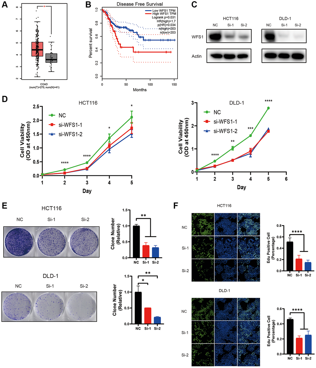 In order to evaluate the potential role of WFS1 in COAD, we inhibited the expression of WFS1 with two independent siRNAs in HCT116 and DLD-1 cell lines. These two siRNAs significantly decrease the protein expression of WFS1 (Figure 4C). WFS1 depletion markedly inhibited cell viability and clone formation capability of COAD cells (P < 0.05, Figure 4D–4F). In summary, these results indicate that WFS1 has a potential carcinogenic effect in COAD.