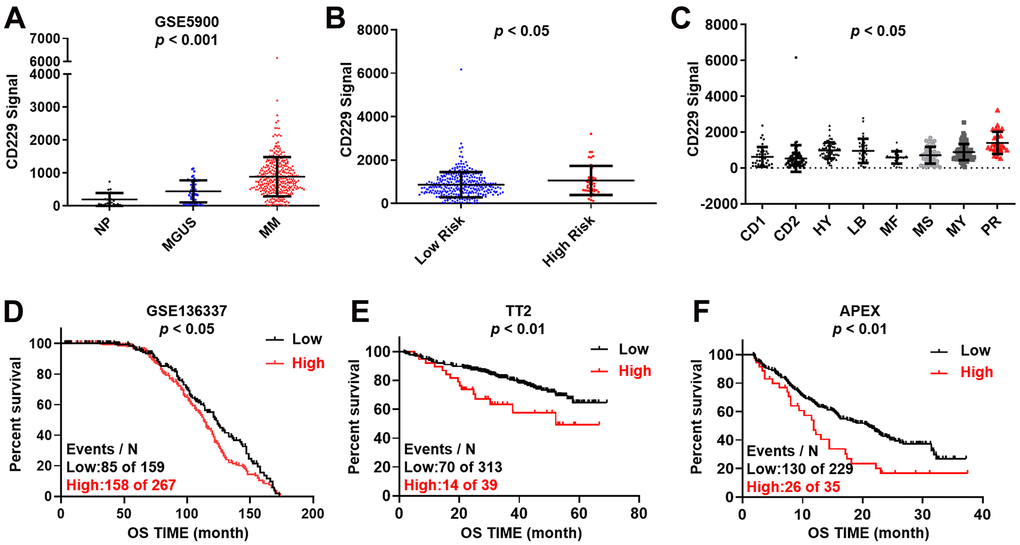 To assess the expression of CD229 in MM, we first examined the expression of CD229 in normal plasma (NP, n = 22), monoclonal gammopathy of undetermined significance (MGUS, n = 44) and MM patients (MM, n = 351) (gene expression dataset GSE5900). The results showed that the CD229 mRNA level was significantly increased from NP, MGUS to MM patients during disease progression (p < 0.001) (Figure 1A). Intriguingly, we also observed higher CD229 expression in high-risk MM patients than low-risk patients in the GSE2658 dataset (p < 0.05) (Figure 1B). In detail, CD229 expression in PR group, the worst subgroup in MM patients, was dramatically higher than those in the other 7 subgroups (p < 0.05) (Figure 1C). High expression of CD229 was significantly associated with poor overall survival (OS) in GSE136337 (p < 0.05) (Figure 1D). Furthermore, MM patients bearing elevated CD229 expression suffered from poor prognosis in both newly diagnosed MM from TT2 (Total Therapy 2) cohort (p < 0.01) (Figure 1E) and relapsed MM patients from APEX (Assessment of Proteasome inhibition for Extending remissions) cohort (p < 0.01) (Figure 1F). Collectively, these results demonstrate that CD229 acting as an oncogene may confer a poor prognosis in MM patients.